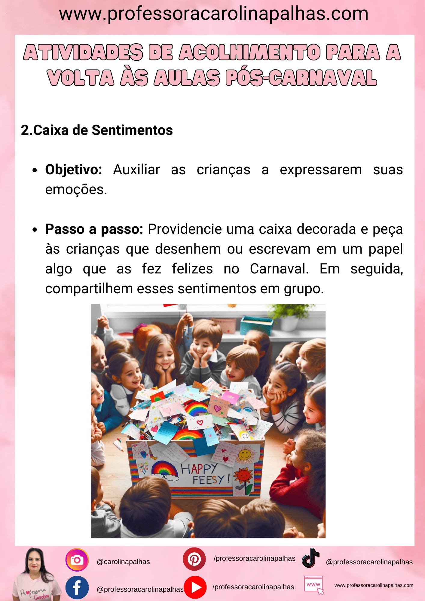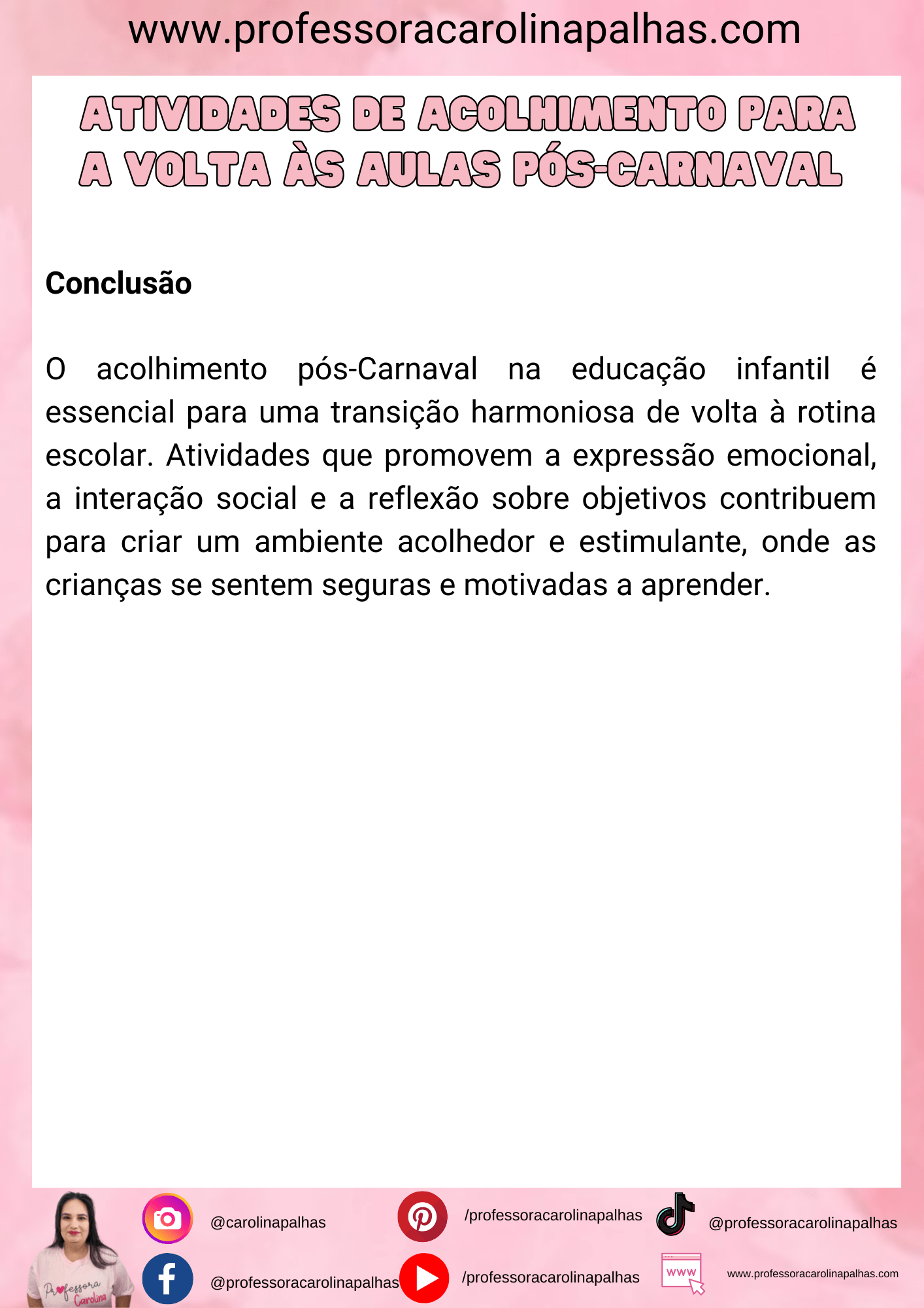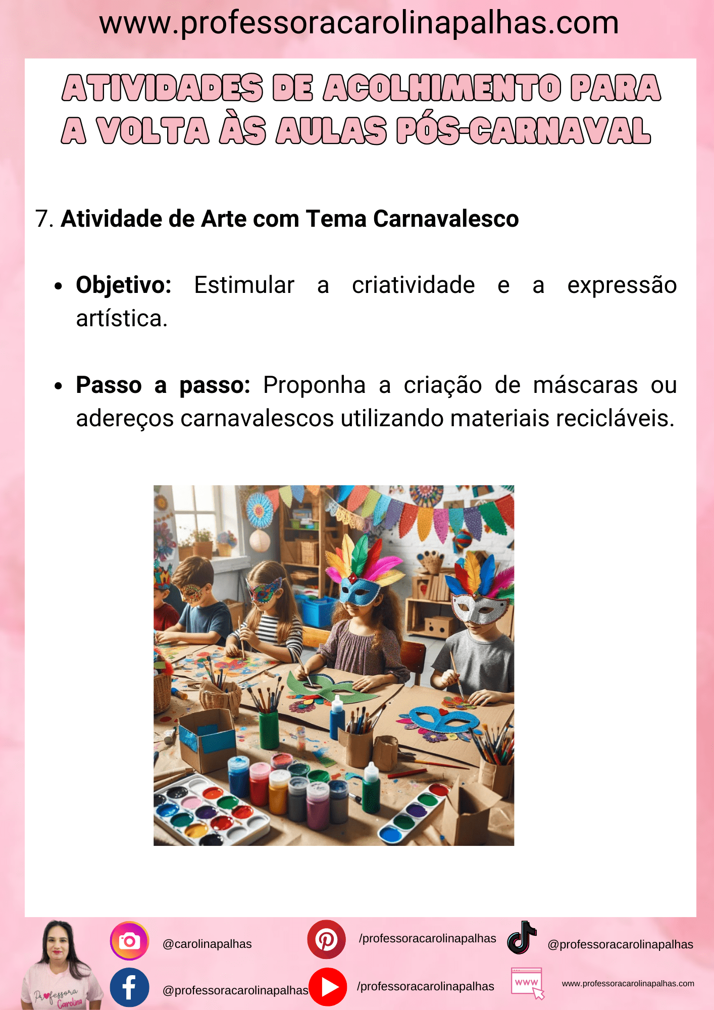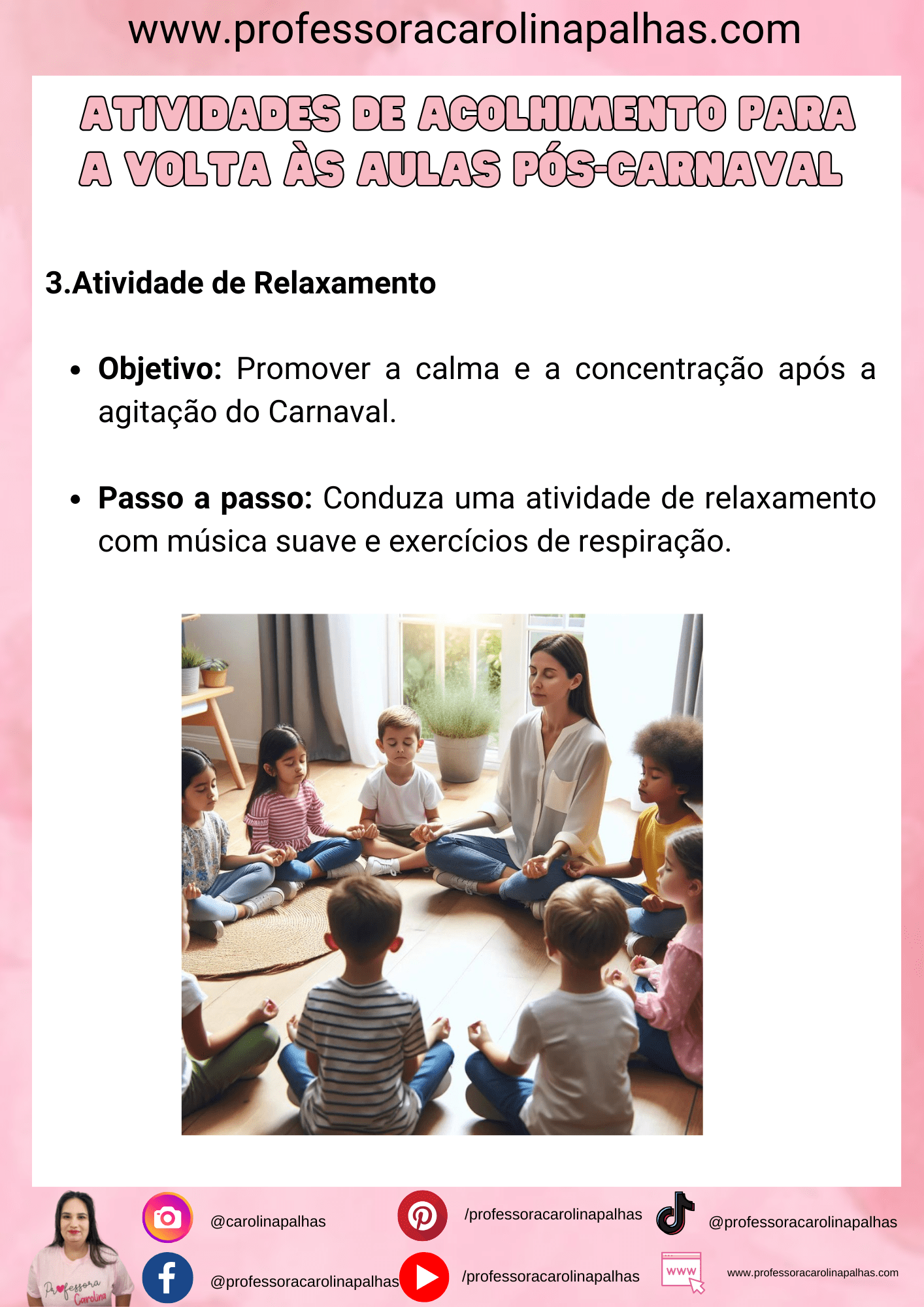- Atividade de Relaxamento: Promove a calma e a concentração após a agitação do Carnaval.