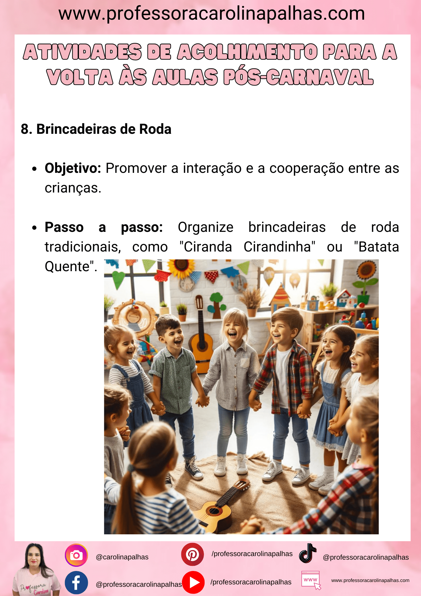- Brincadeiras de Roda: Promove a interação e a cooperação entre as crianças.