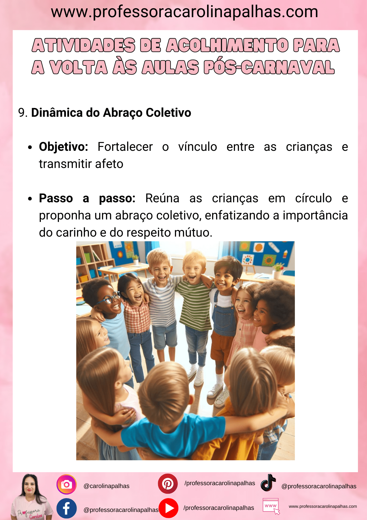 - Dinâmica do Abraço Coletivo: Fortalece o vínculo entre as crianças e transmite afeto.
