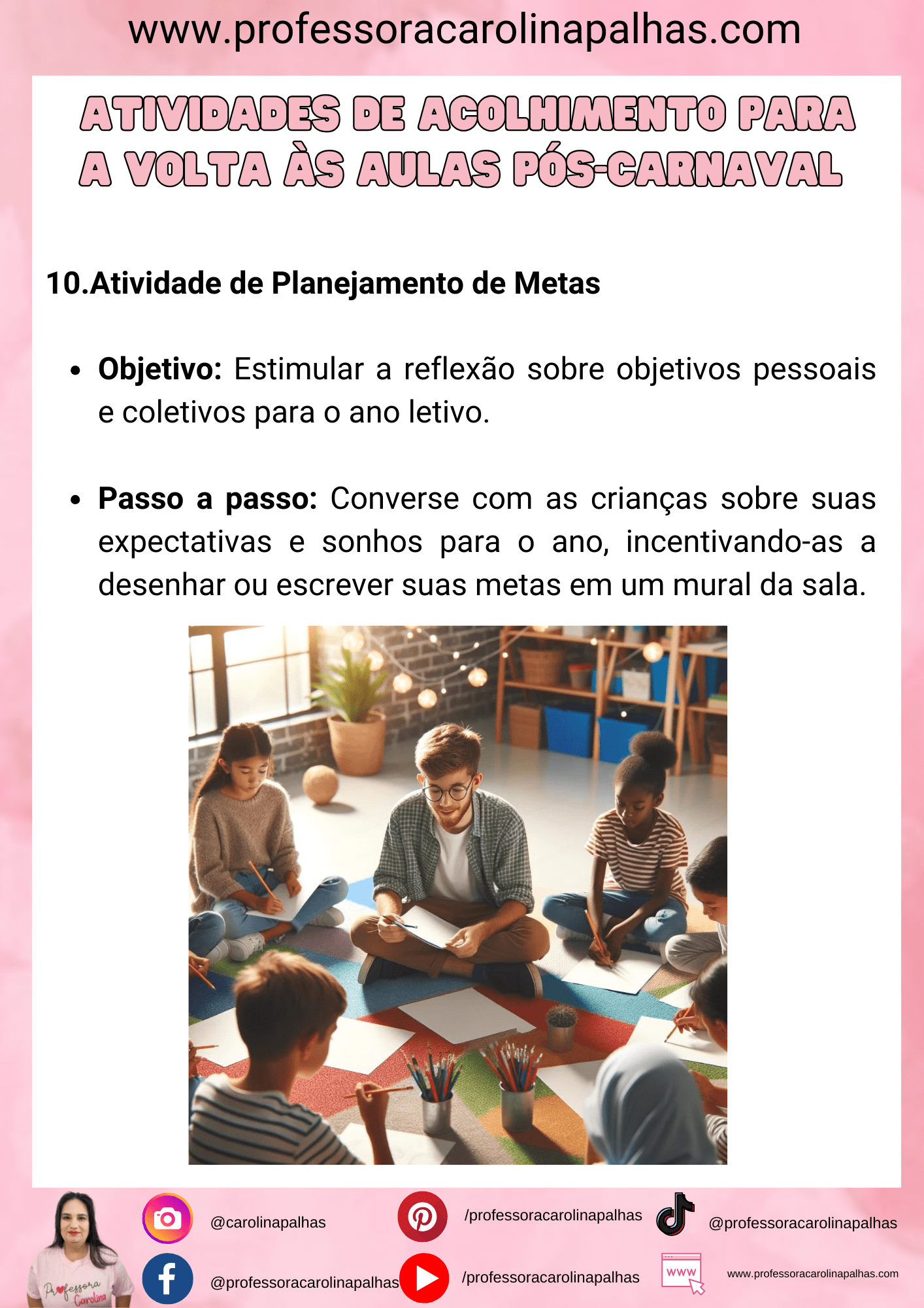 - Atividade de Planejamento de Metas: Estimula a reflexão sobre objetivos pessoais e coletivos para o ano letivo.