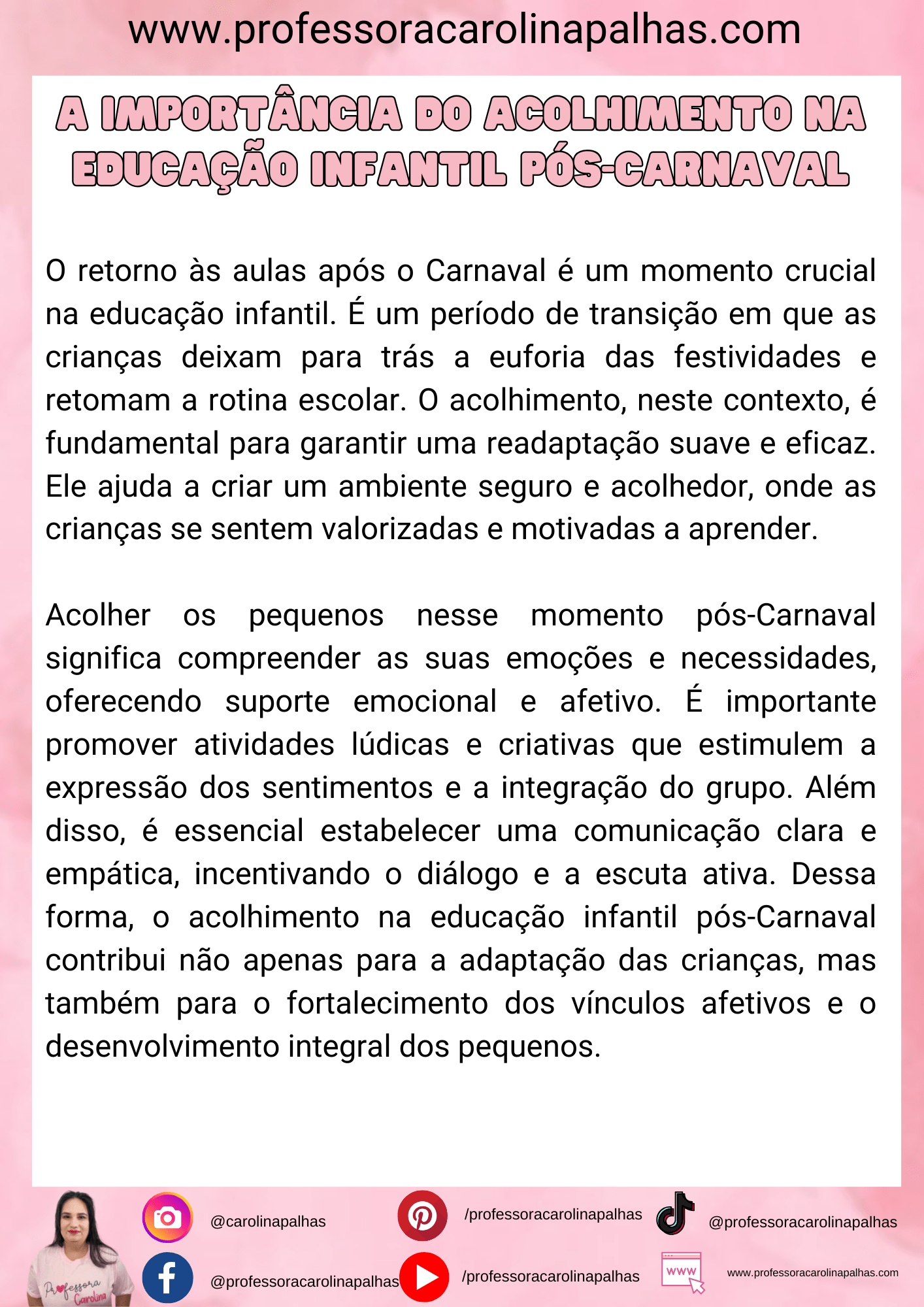 O retorno às aulas após o Carnaval é um período de transição importante na educação infantil. As crianças deixam para trás a euforia das festividades e retomam a rotina escolar. Neste momento, o acolhimento é fundamental para garantir uma readaptação suave e eficaz, criando um ambiente seguro e acolhedor, onde as crianças se sentem valorizadas e motivadas a aprender.