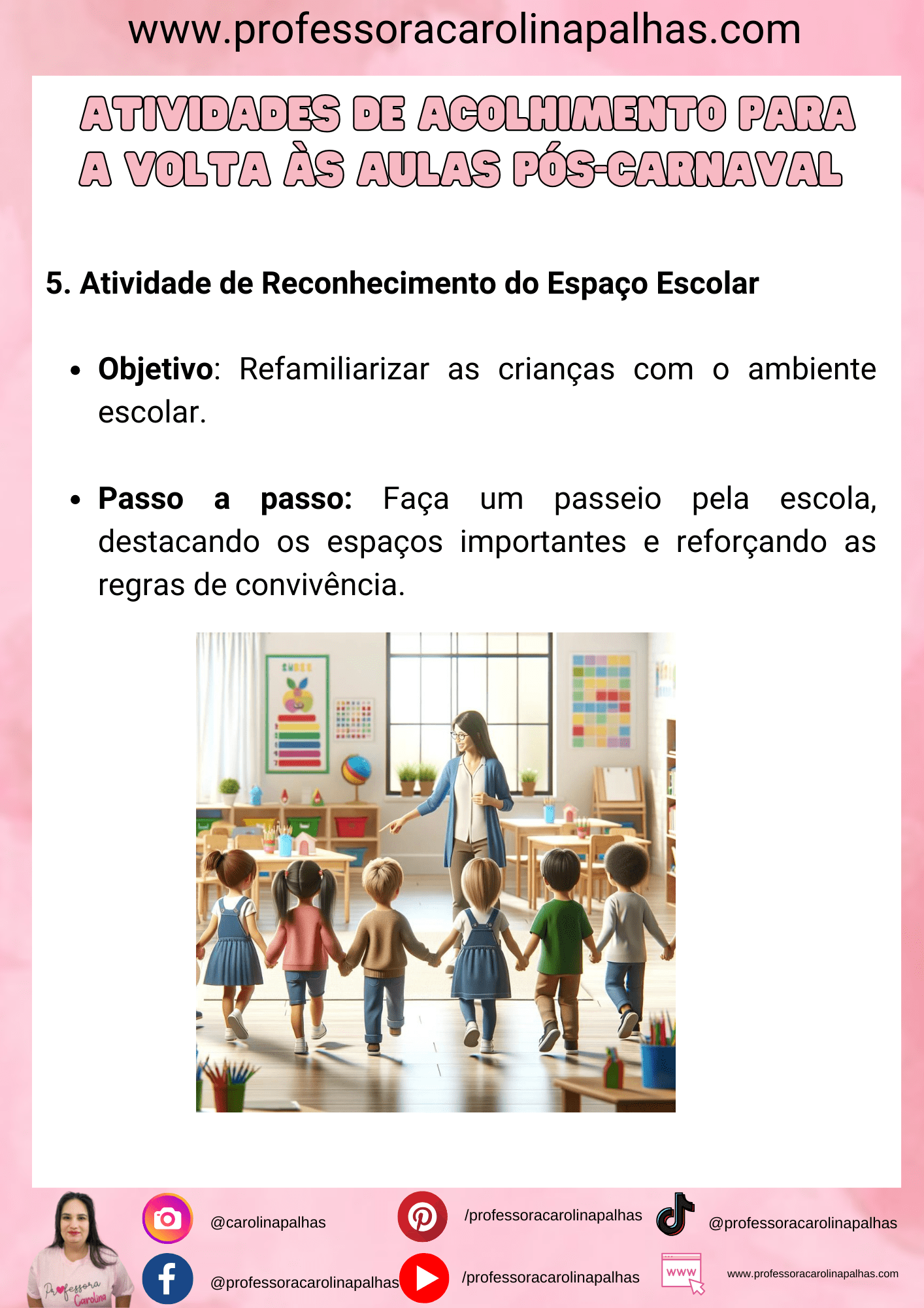 - Atividade de Reconhecimento do Espaço Escolar: Refamiliariza as crianças com o ambiente escolar.