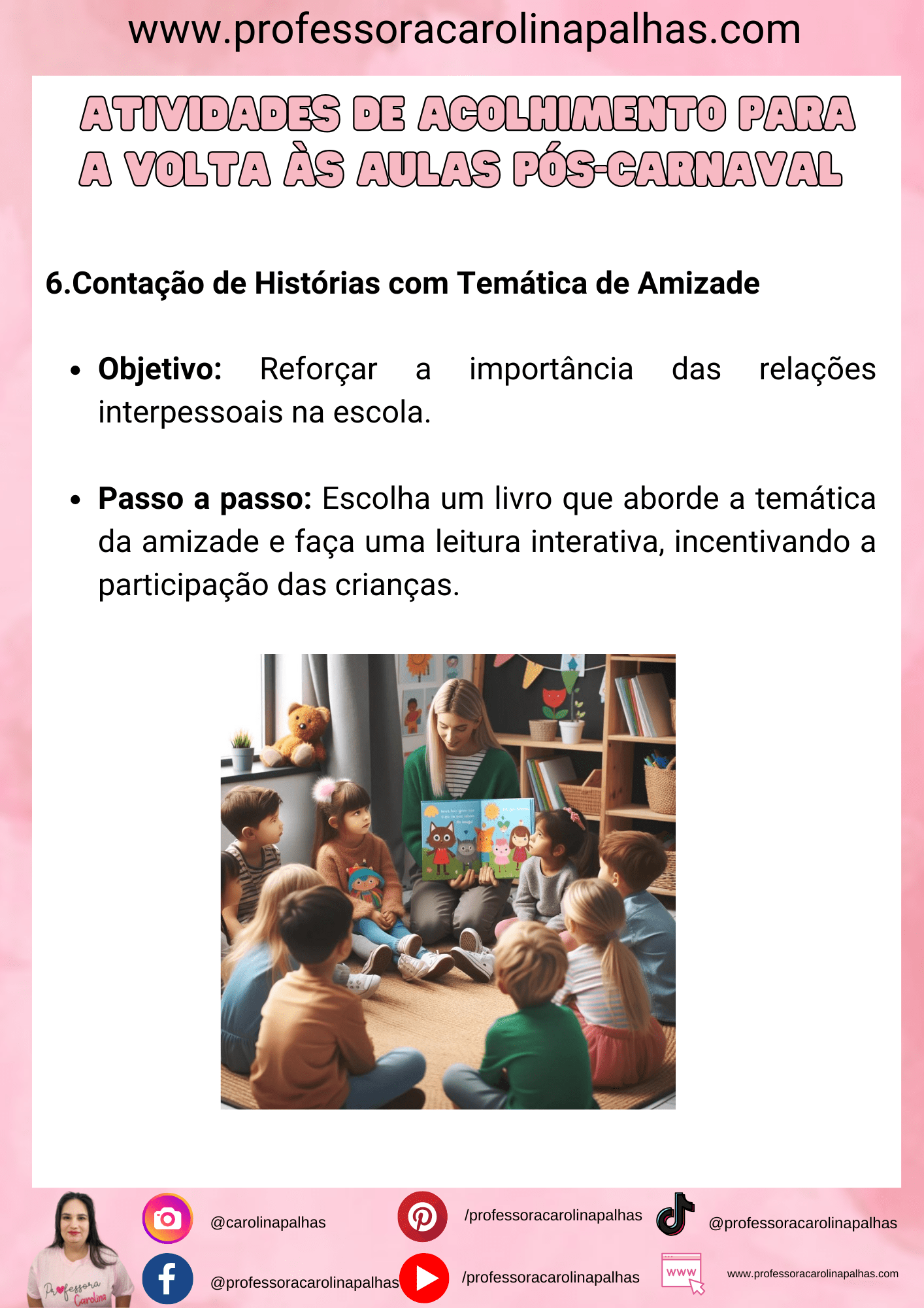 - Contação de Histórias com Temática de Amizade: Reforça a importância das relações interpessoais na escola.
