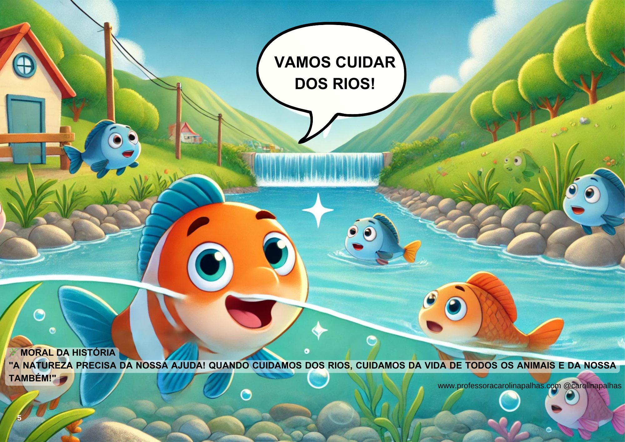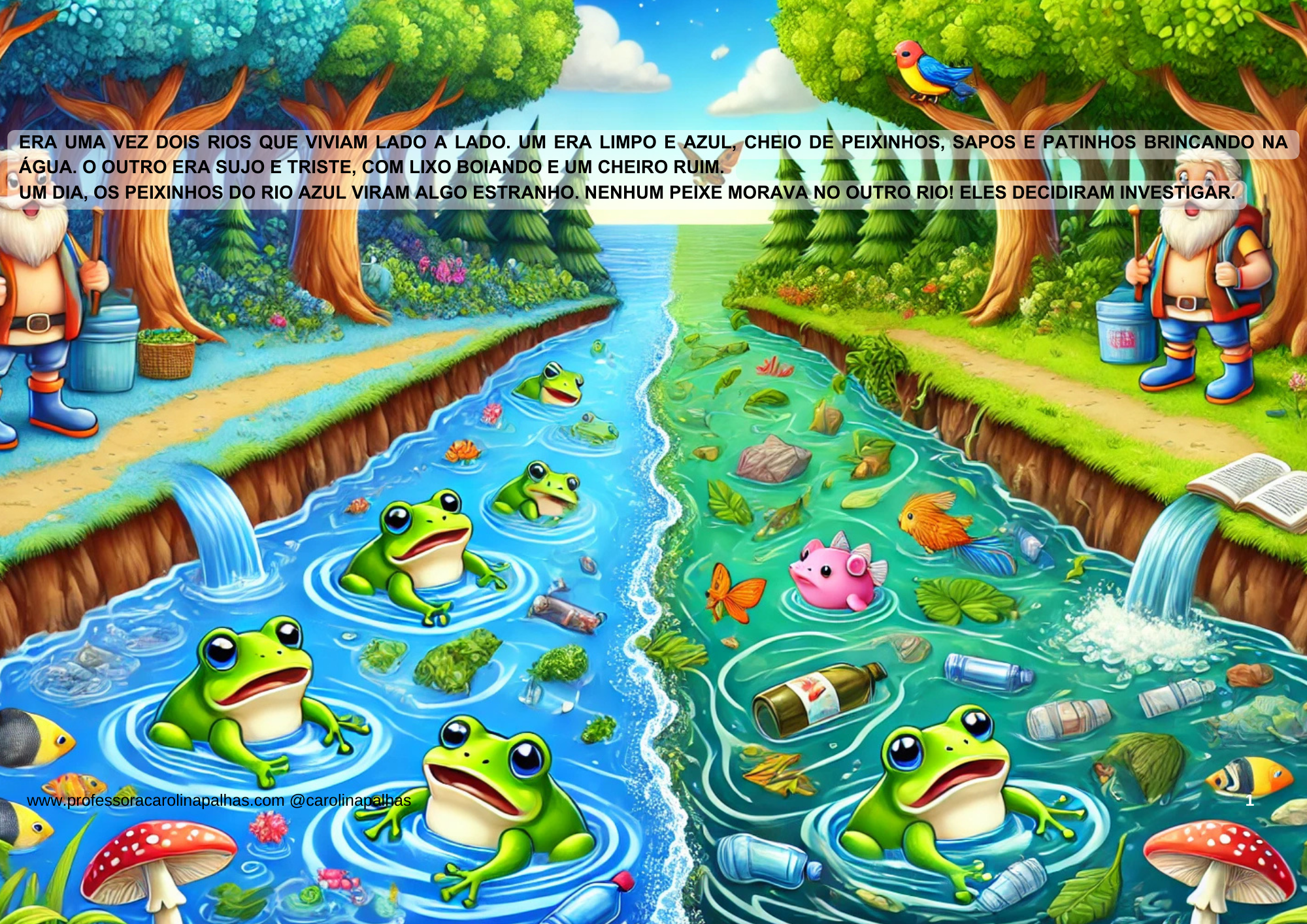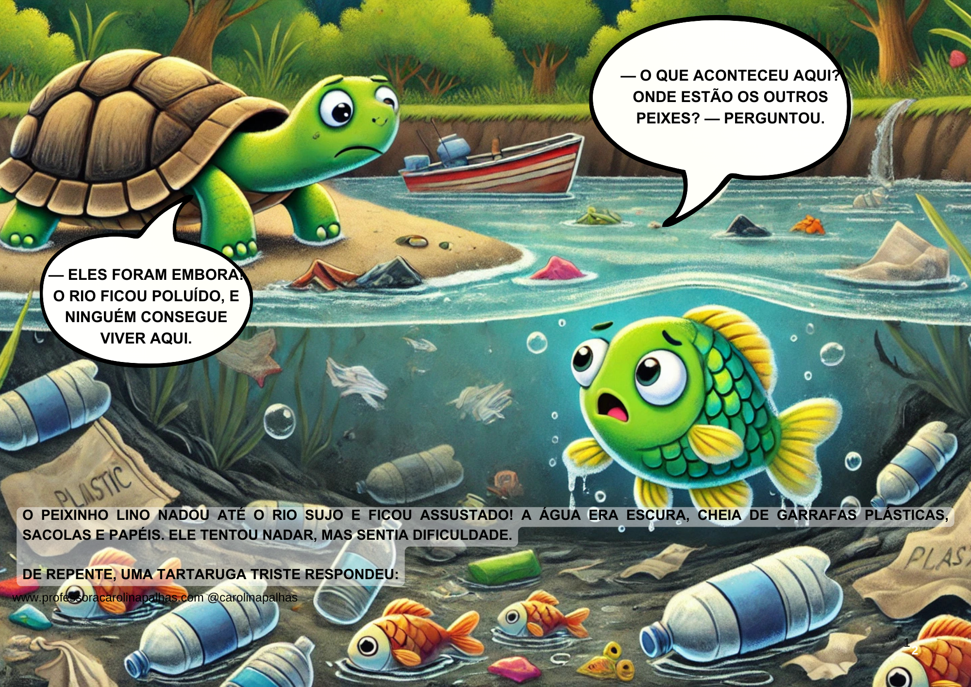 - Perguntar o que observaram: “Por que um rio era feliz e o outro triste?” “O que aconteceu com os peixinhos?”