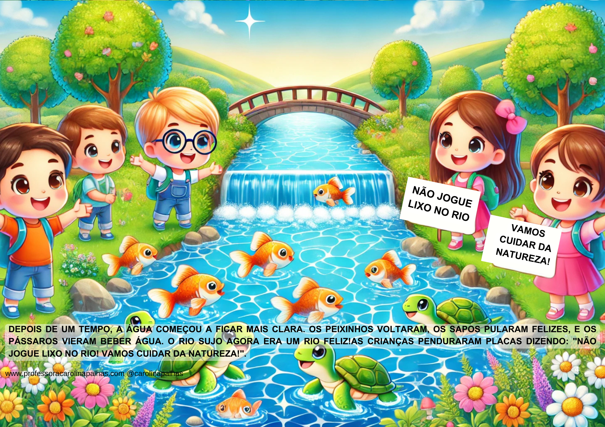 - Ler a história “O Rio Triste e o Rio Feliz” com expressão e entonação para envolver as crianças.