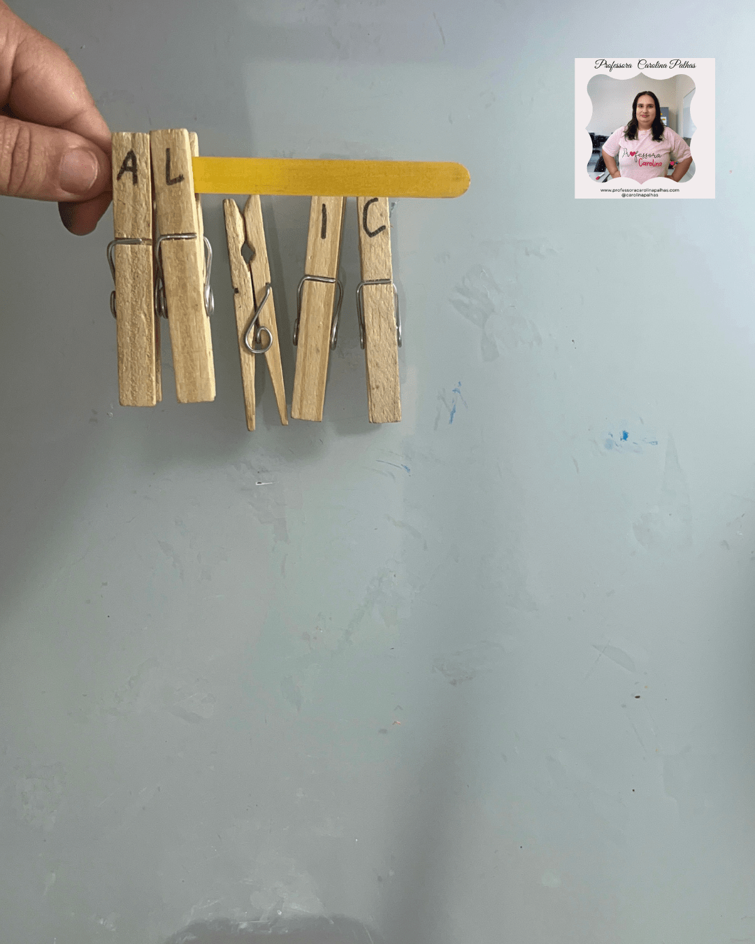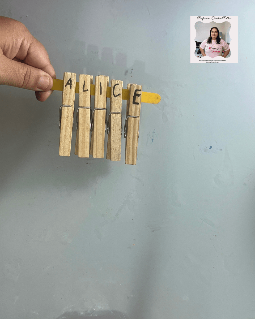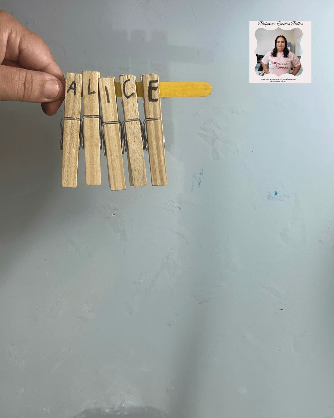 - 🖐️ Brincando com Prendedores: Escrever cada letra do nome nos prendedores e montar no palito de sorvete.