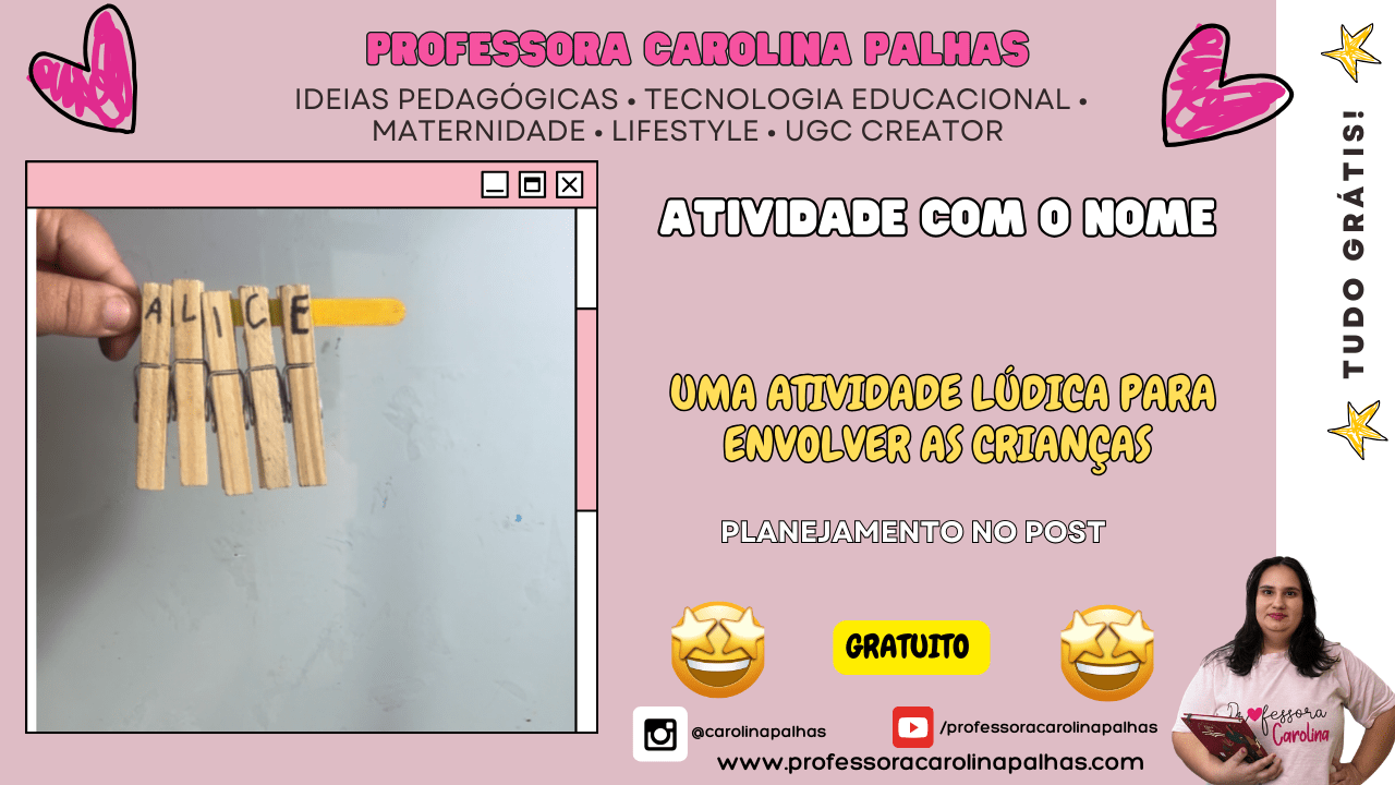 Palavras-chave: atividade com o nome, atividade nome próprio, reconhecimento do nome, aprendizado do nome, atividades com letras, atividade com prendedores, alfabetização infantil, ensino lúdico, brincadeiras educativas, BNCC educação infantil, atividades para maternal, atividades para pré-escola, nome próprio na alfabetização, coordenação motora fina, desenvolvimento infantil, atividade de fixação de letras, aprendizado interativo, nome e identidade, habilidades motoras na educação infantil, aprendizado com prendedores, atividades com palitos de sorvete, atividades de linguagem oral.