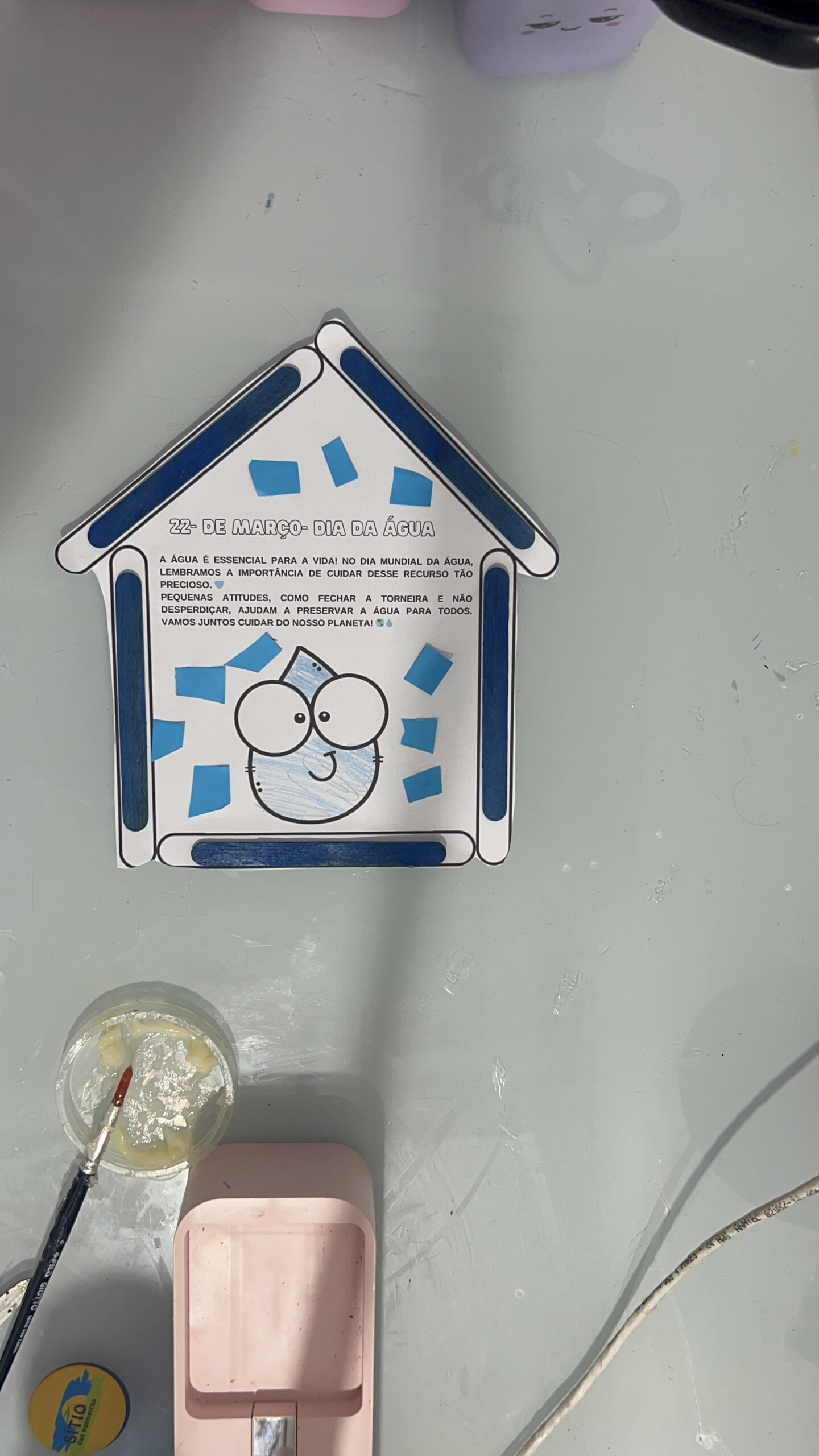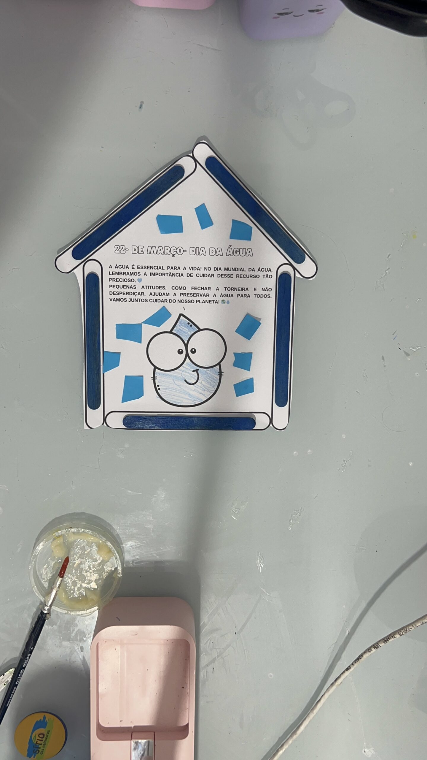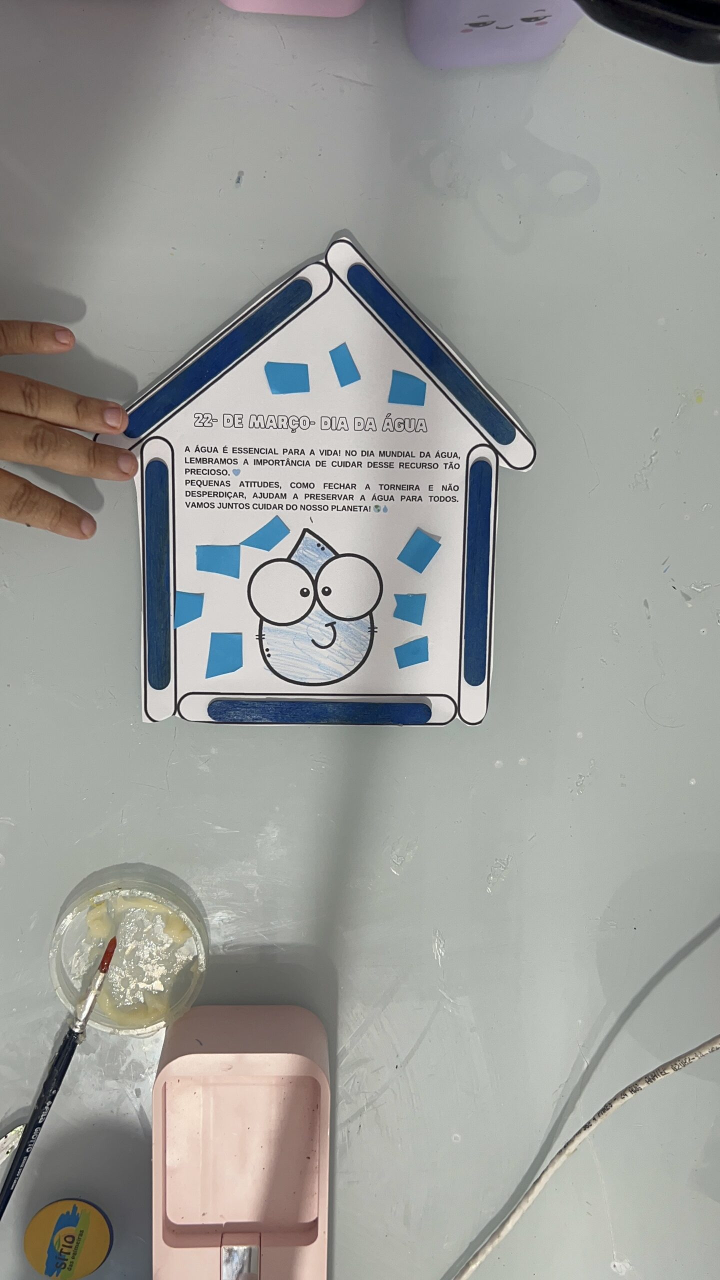 - Desenvolvimento: As crianças pintam e montam a Casa da Gotinha, colando elementos que representam o uso correto da água.