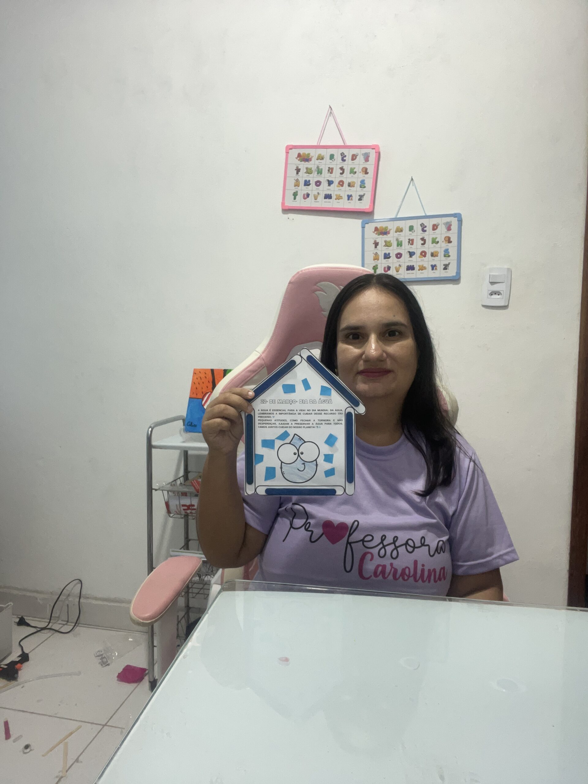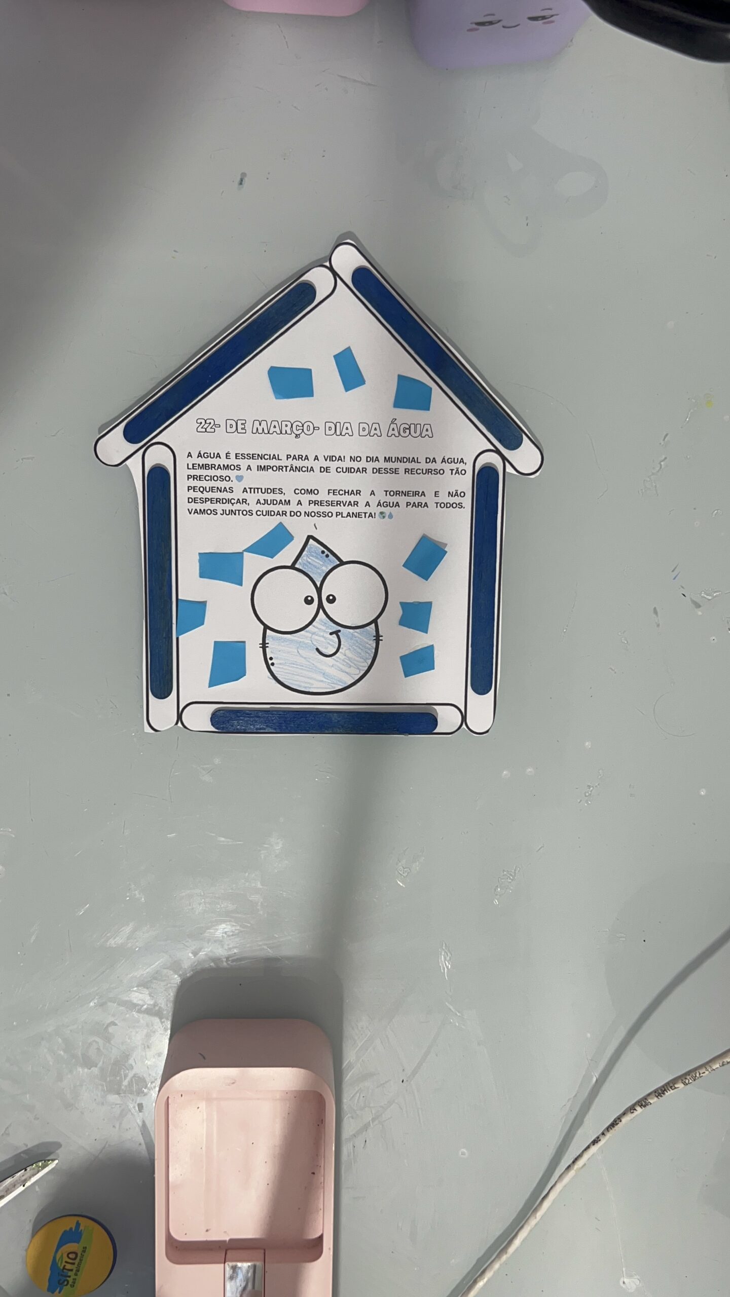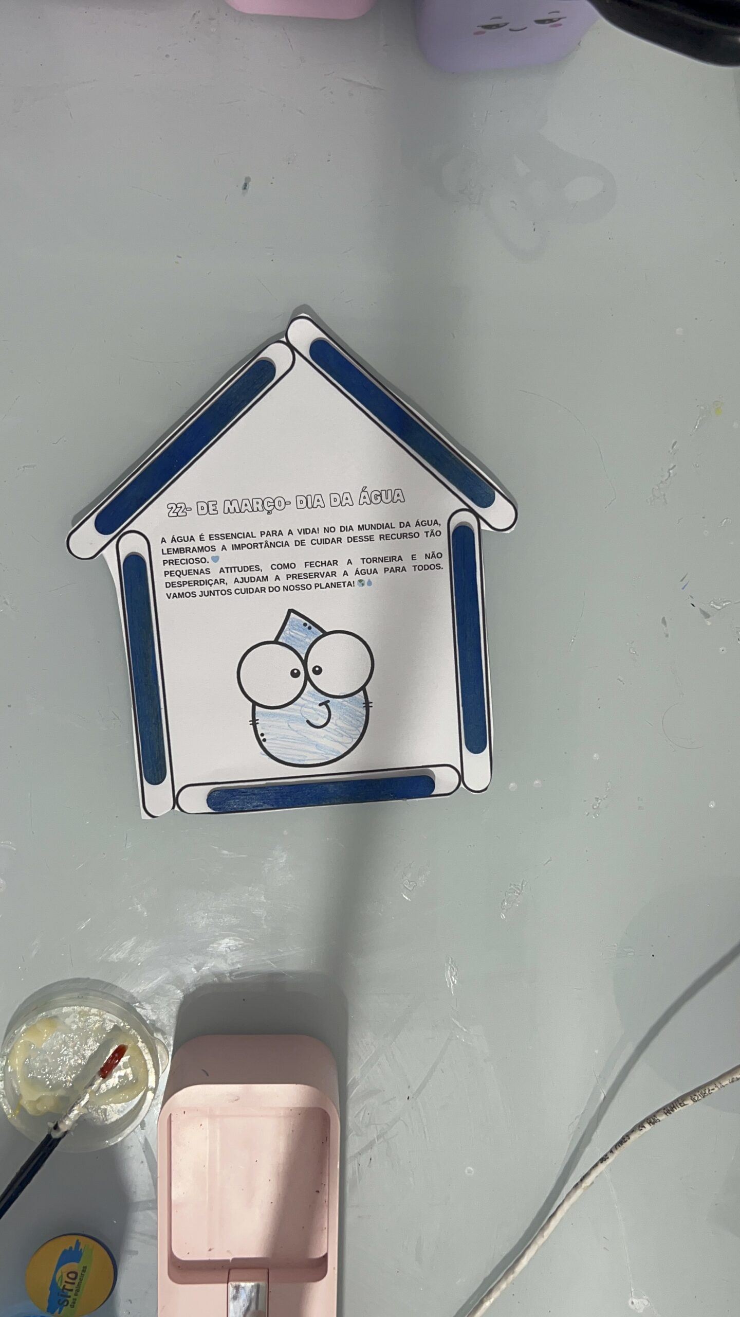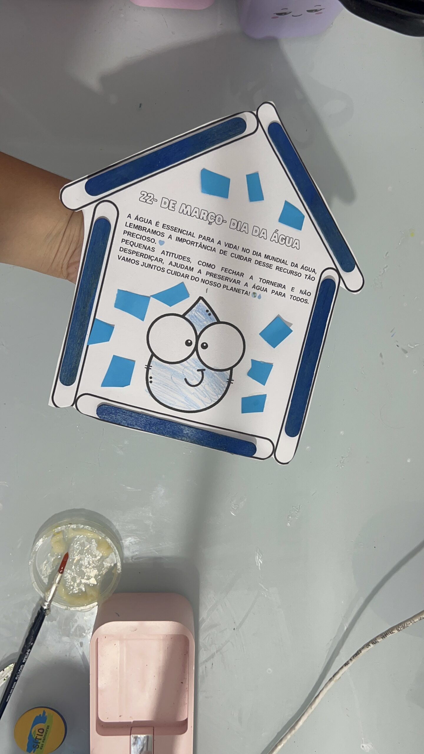- Desenvolvimento: As crianças pintam e montam a Casa da Gotinha, colando elementos que representam o uso correto da água.