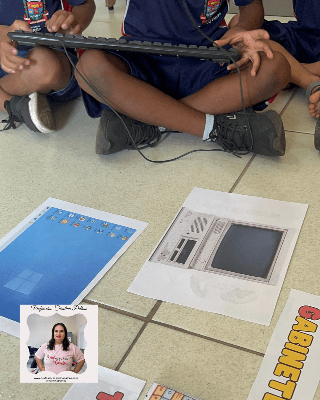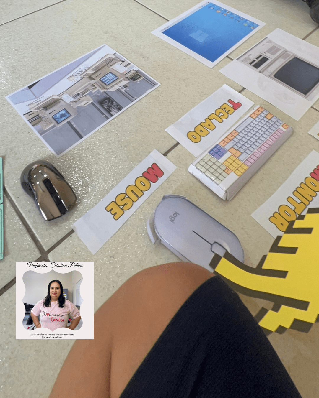 Nessa proposta, as crianças são convidadas a identificar e nomear cada parte do computador a partir de representações físicas em papel e objetos reais (como mouses antigos ou simulados).