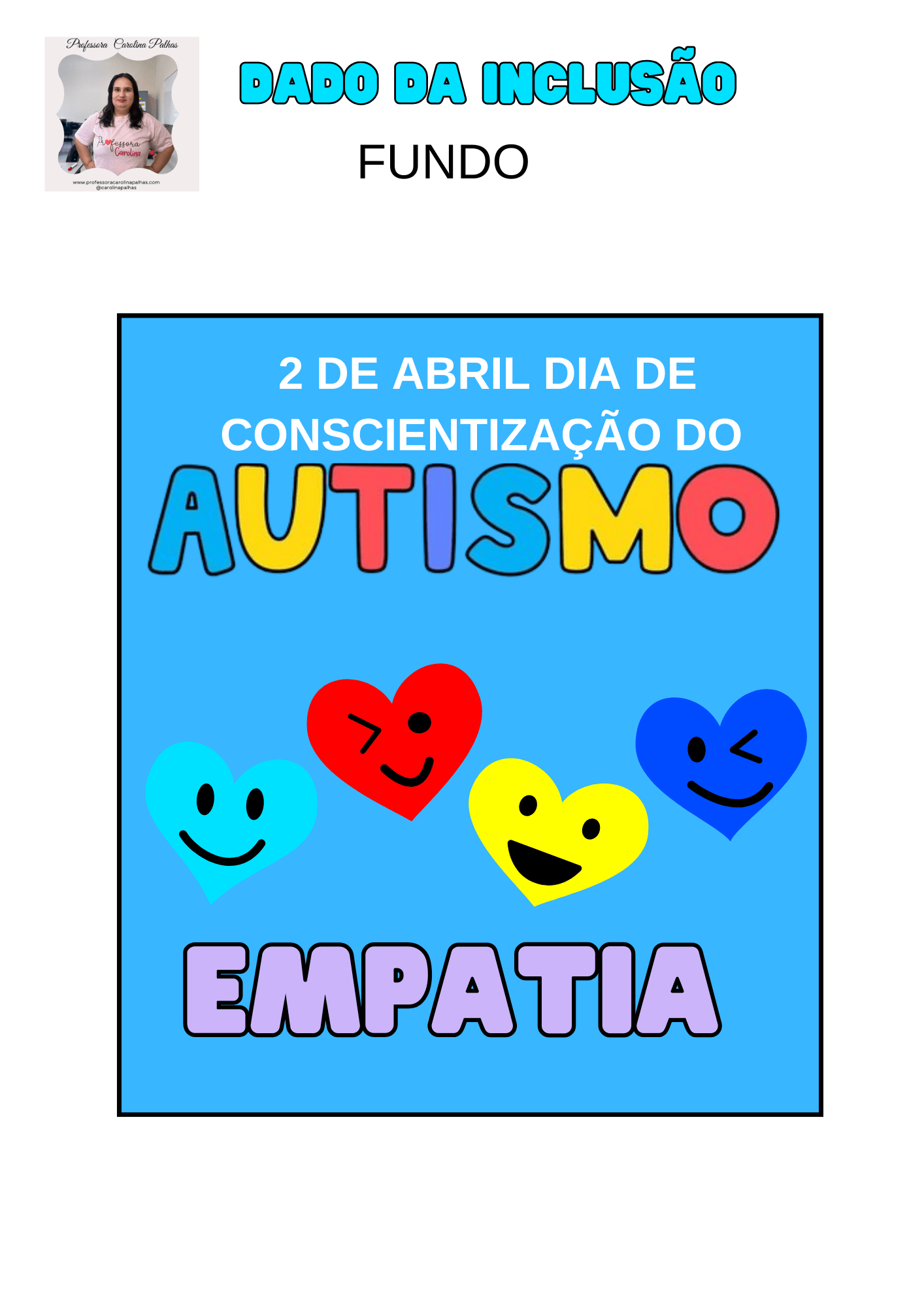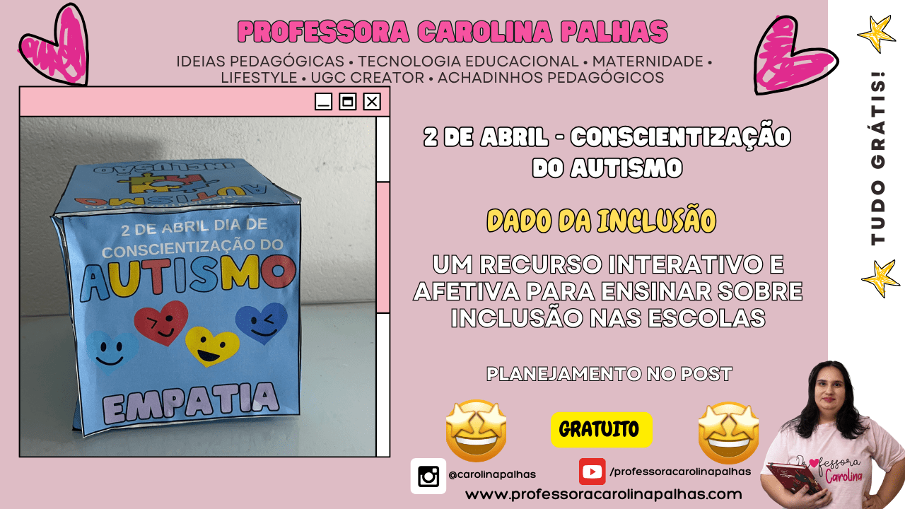 Palavras-chave: dado da inclusão, recurso pedagógico sobre autismo, atividades sobre inclusão, inclusão escolar, 2 de abril dia do autismo, autismo na educação infantil, autismo no ensino fundamental, materiais interativos para autismo, empatia nas escolas, como ensinar inclusão, professora Carolina Palhas, plano de aula autismo, atividades interativas autismo, recursos gratuitos sobre TEA, projeto inclusão escolar, educação infantil inclusão, ensino lúdico, educação com empatia, TEA, conscientização do autismo