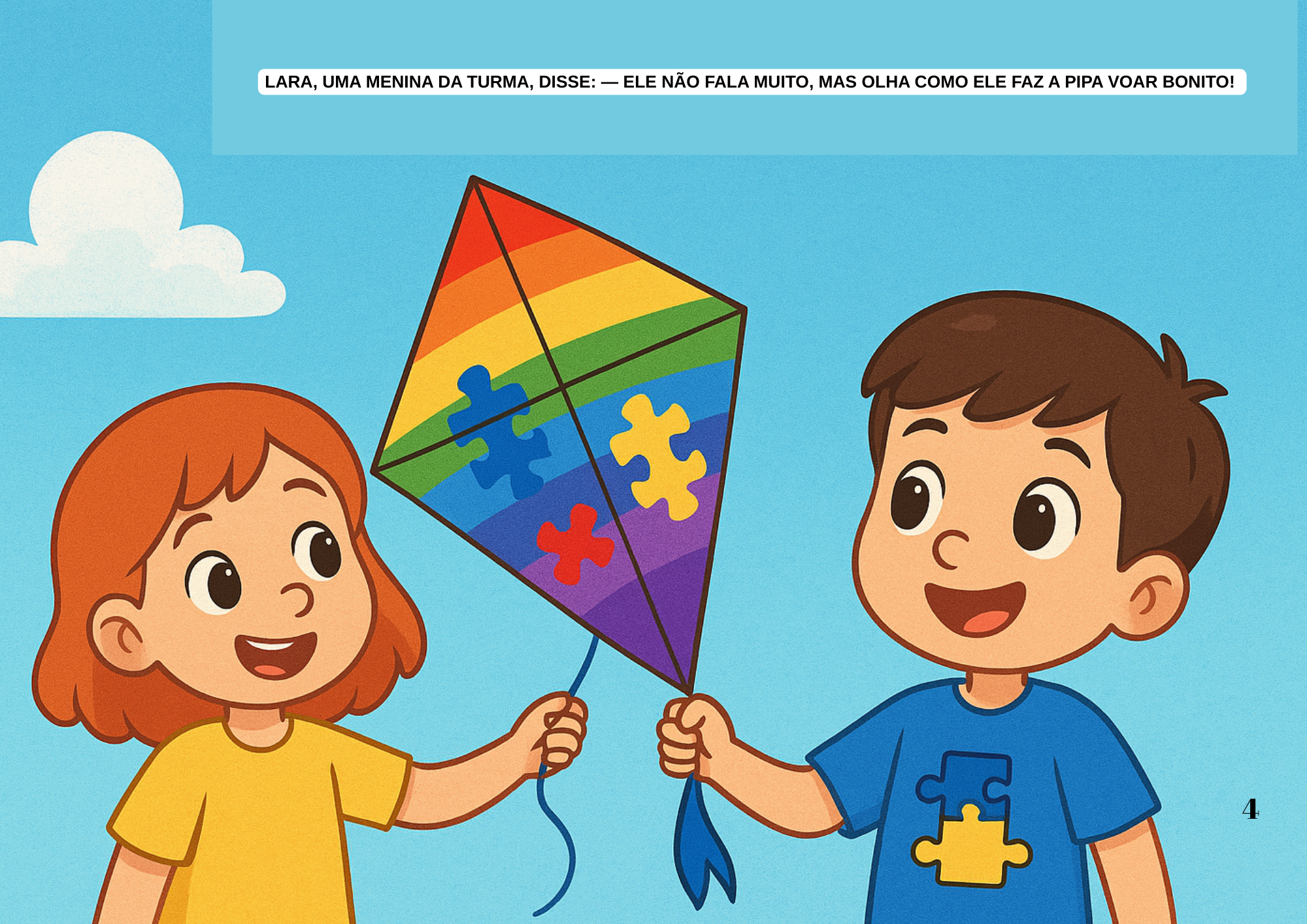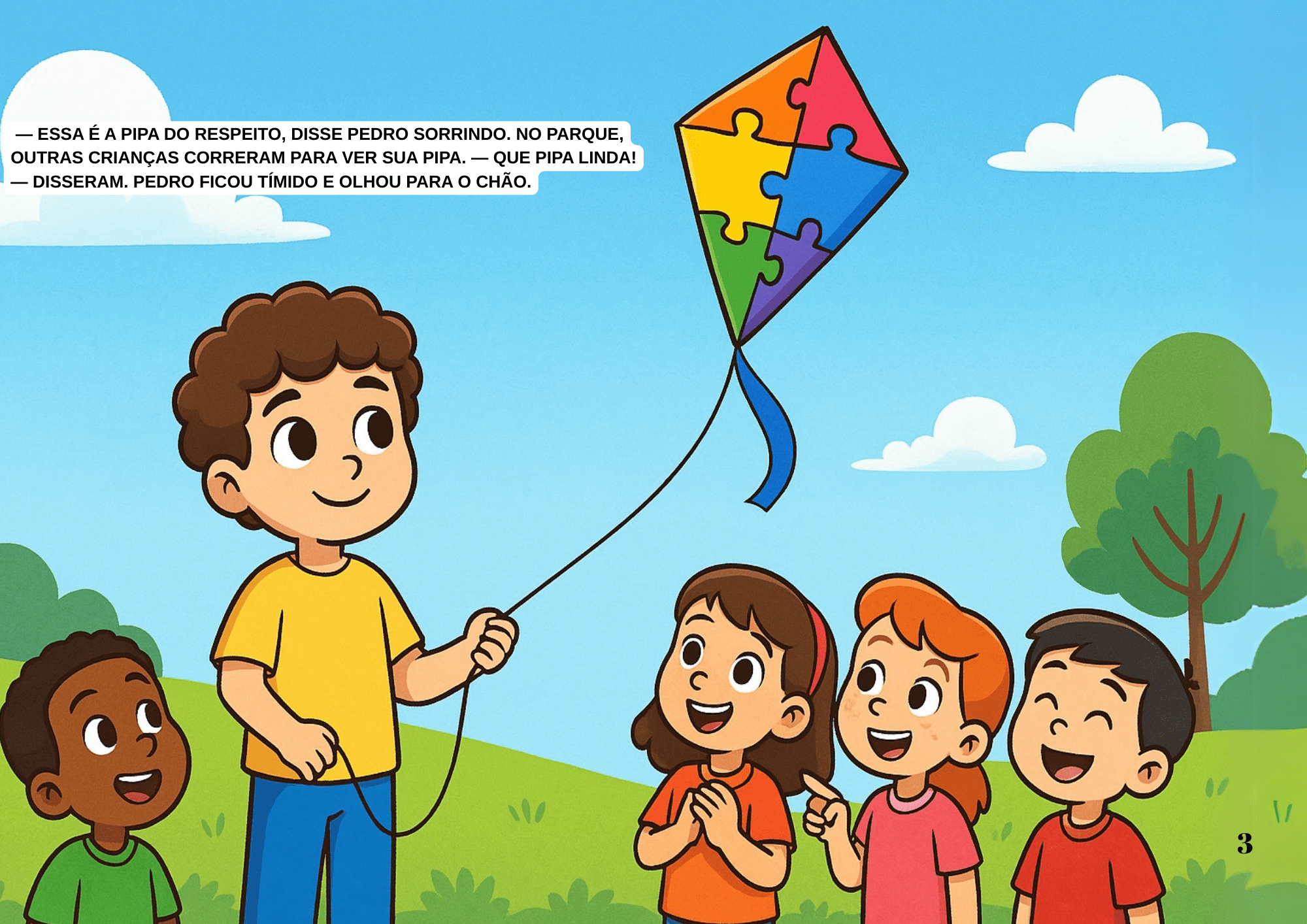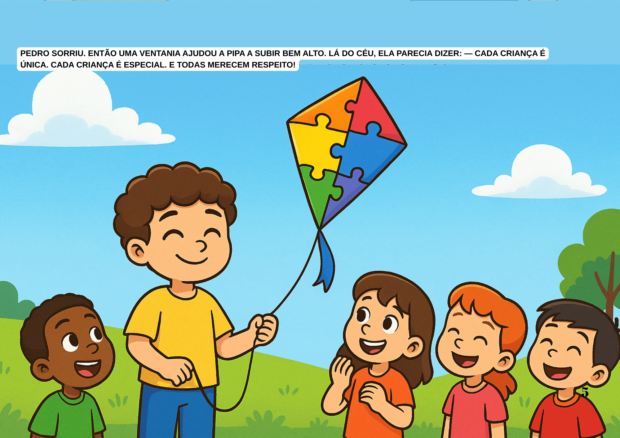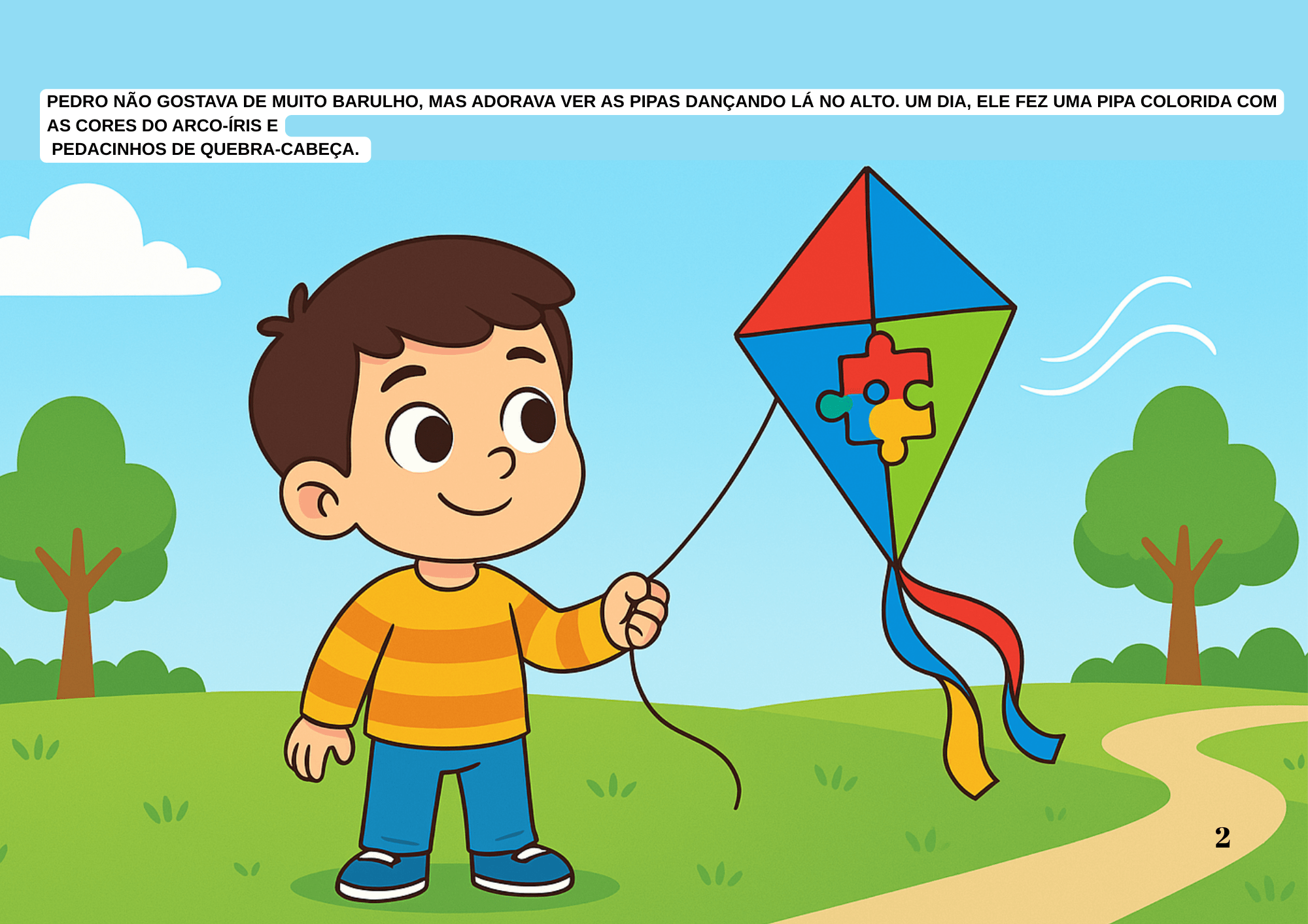 Era uma vez um menino chamado Pedro, que amava pipas. Ele tinha olhos curiosos, um sorriso doce e era muito especial. Pedro era autista. Isso quer dizer que ele via o mundo de um jeitinho diferente — com mais cor, mais silêncio e mais detalhe.