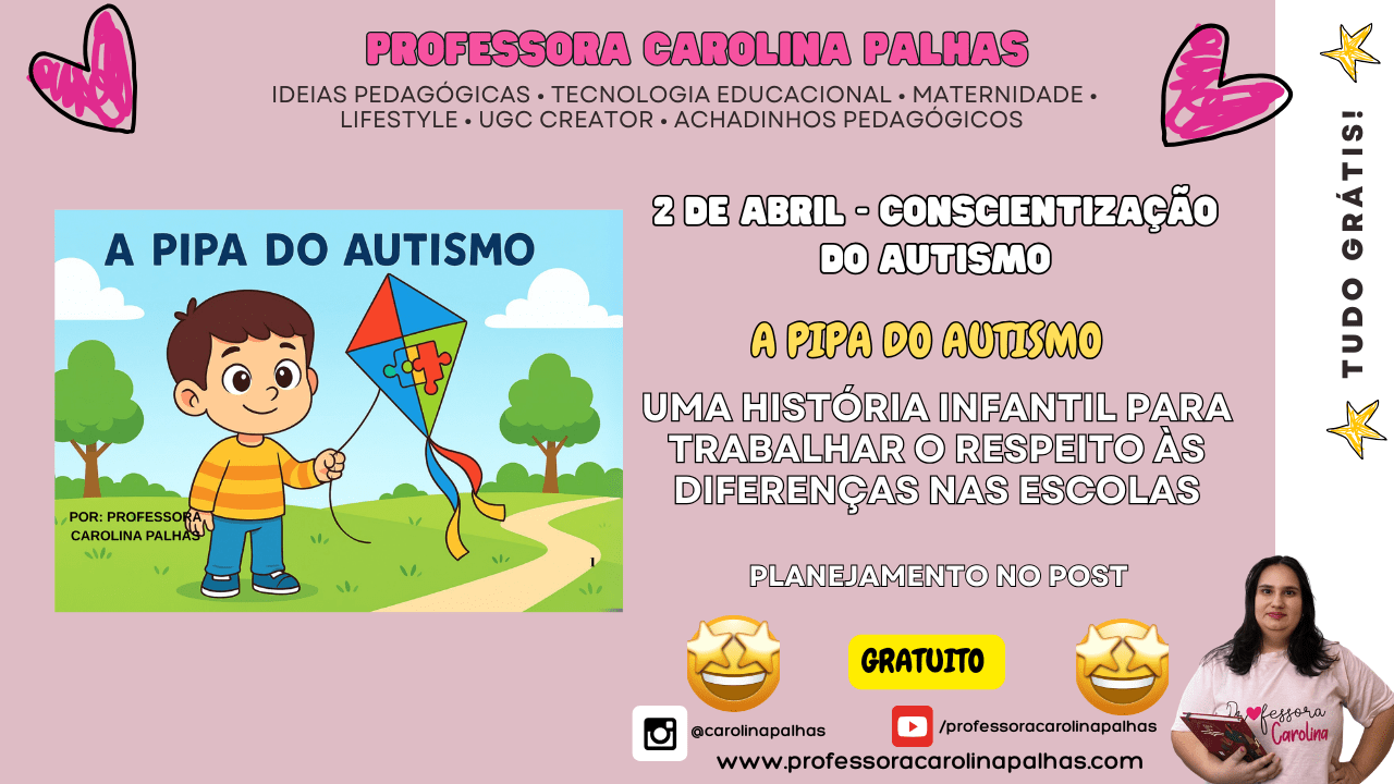 Trabalhar temas como autismo, respeito, empatia e diversidade na educação infantil é essencial para formar crianças mais conscientes e respeitosas. Com base nisso, criamos a história “A Pipa do Autismo“, pensada especialmente para o 2 de abril, Dia Mundial da Conscientização do Autismo. Neste post, você vai conhecer a história completa, ilustrada, com sugestões de atividades pedagógicas, plano de aula, música infantil e recursos para baixar.
