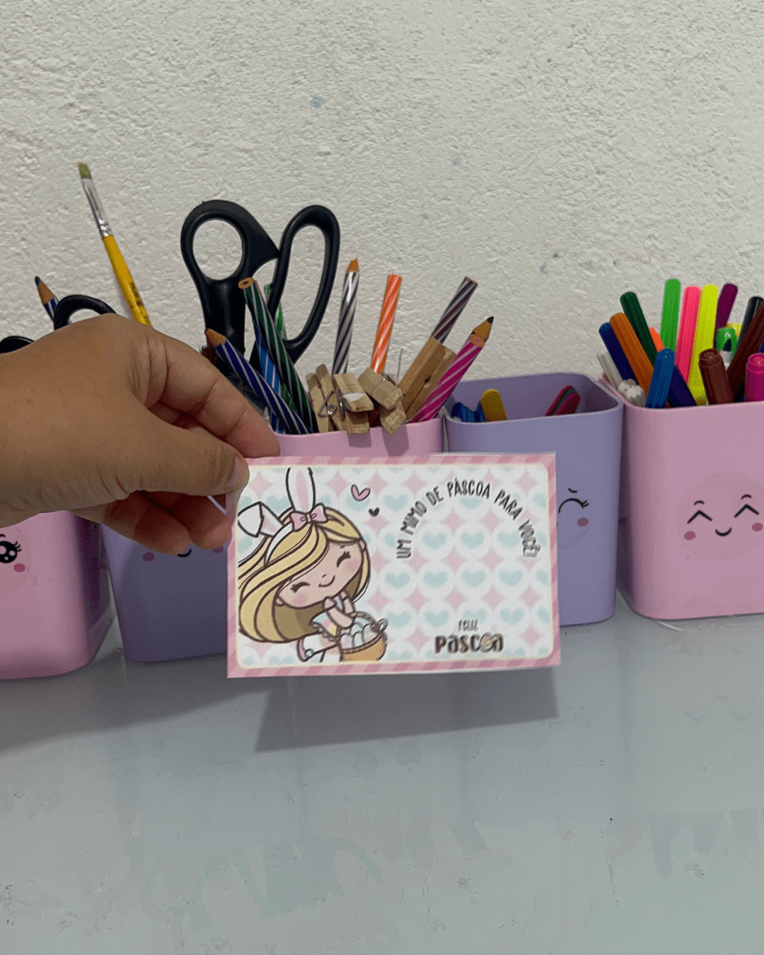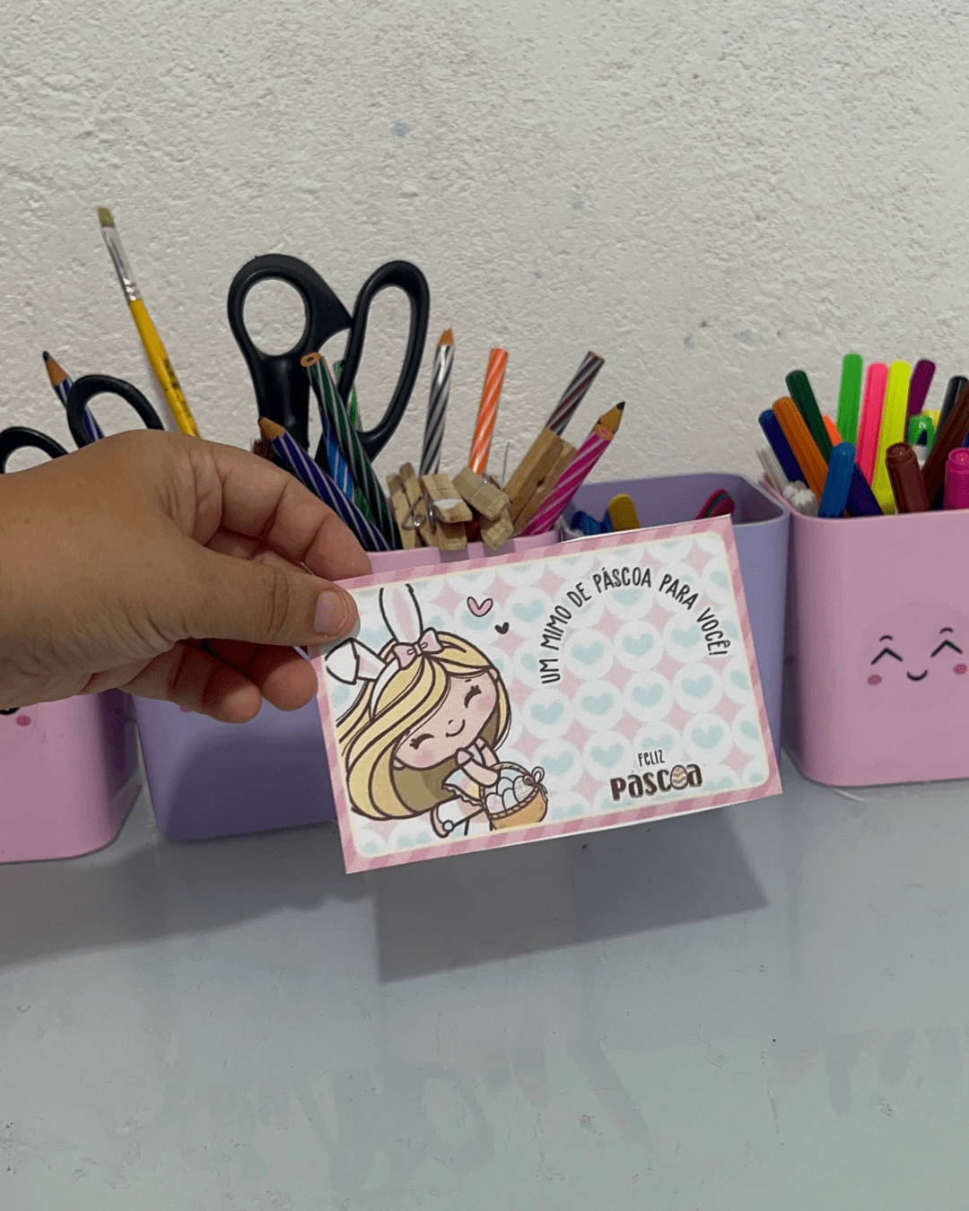 Sugerir que as crianças escrevam o nome e uma frase simples como “Feliz Páscoa!” ou “Com carinho, [nome]”.