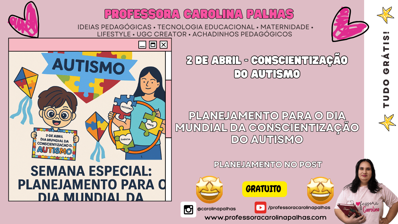 Palavras-chave: Dia Mundial da Conscientização do Autismo, atividades sobre autismo, educação infantil, inclusão, planejamento semanal, atividades lúdicas, BNCC, autismo na escola, desenvolvimento infantil, atividades pedagógicas, empatia, respeito, amor, ensino infantil, autismo, conscientização, diversidade, educação com amor, plano de aula autismo
