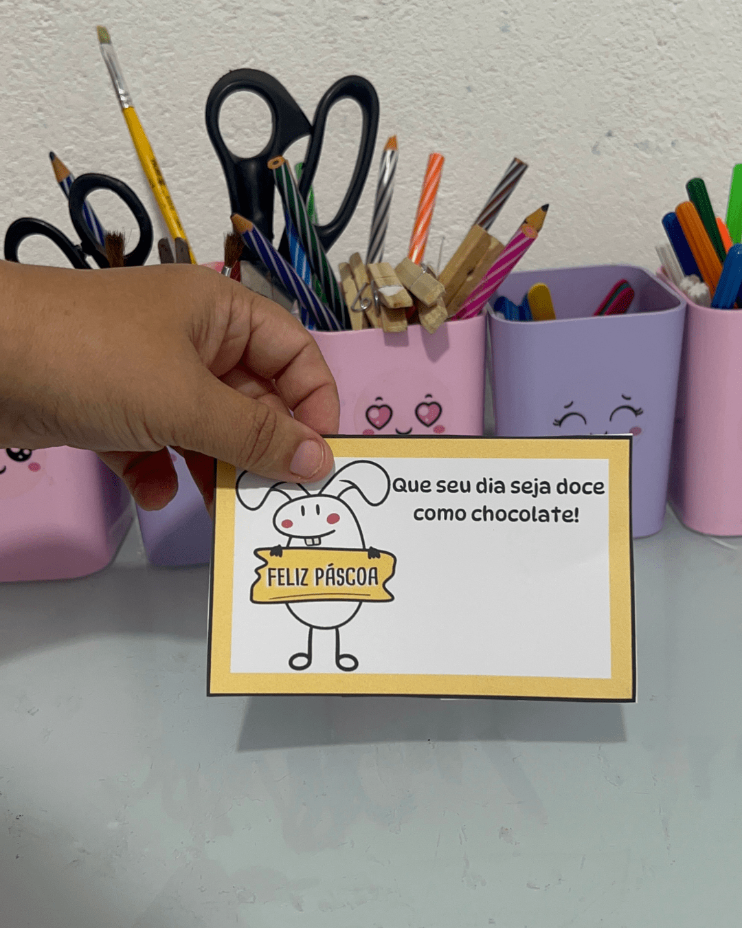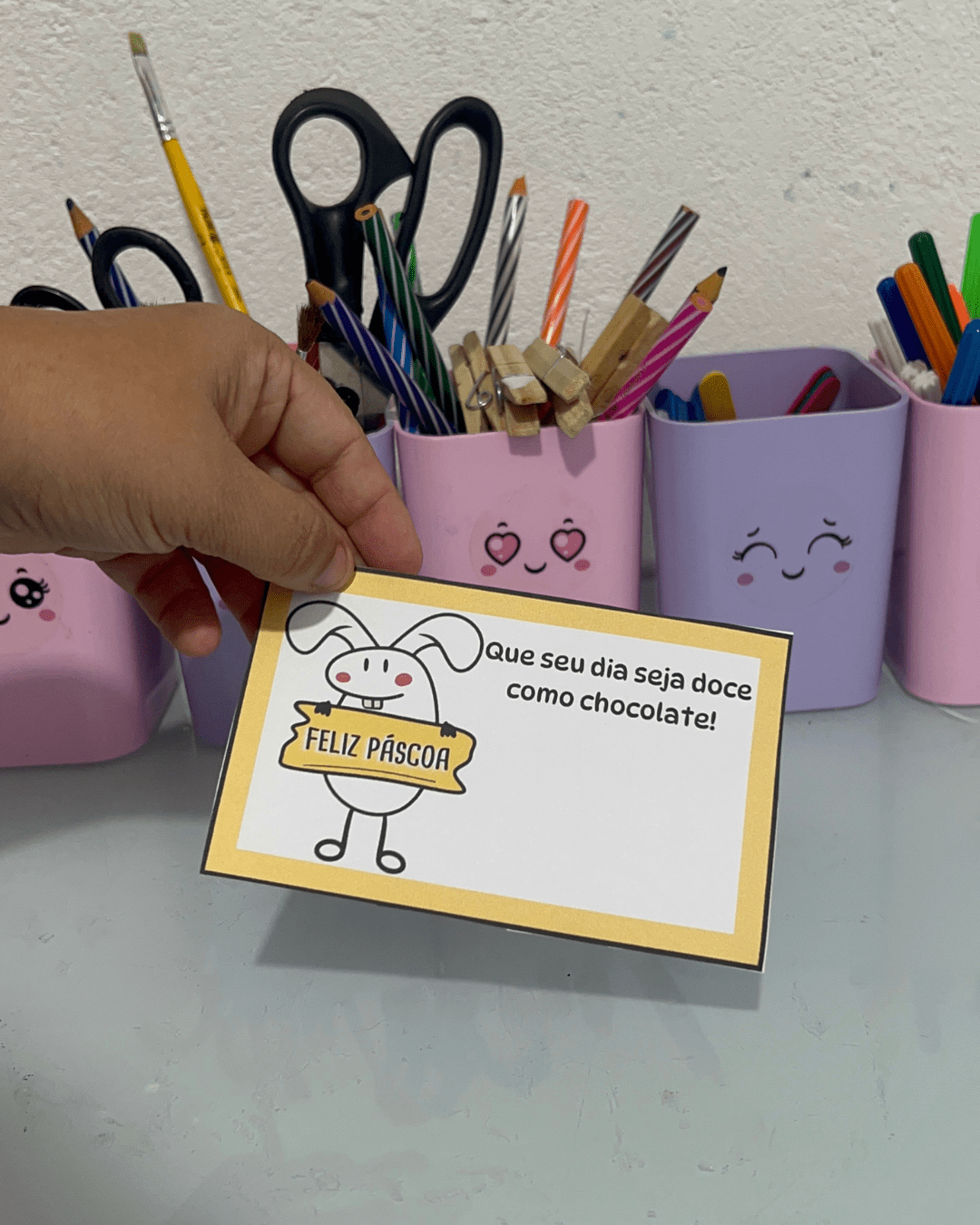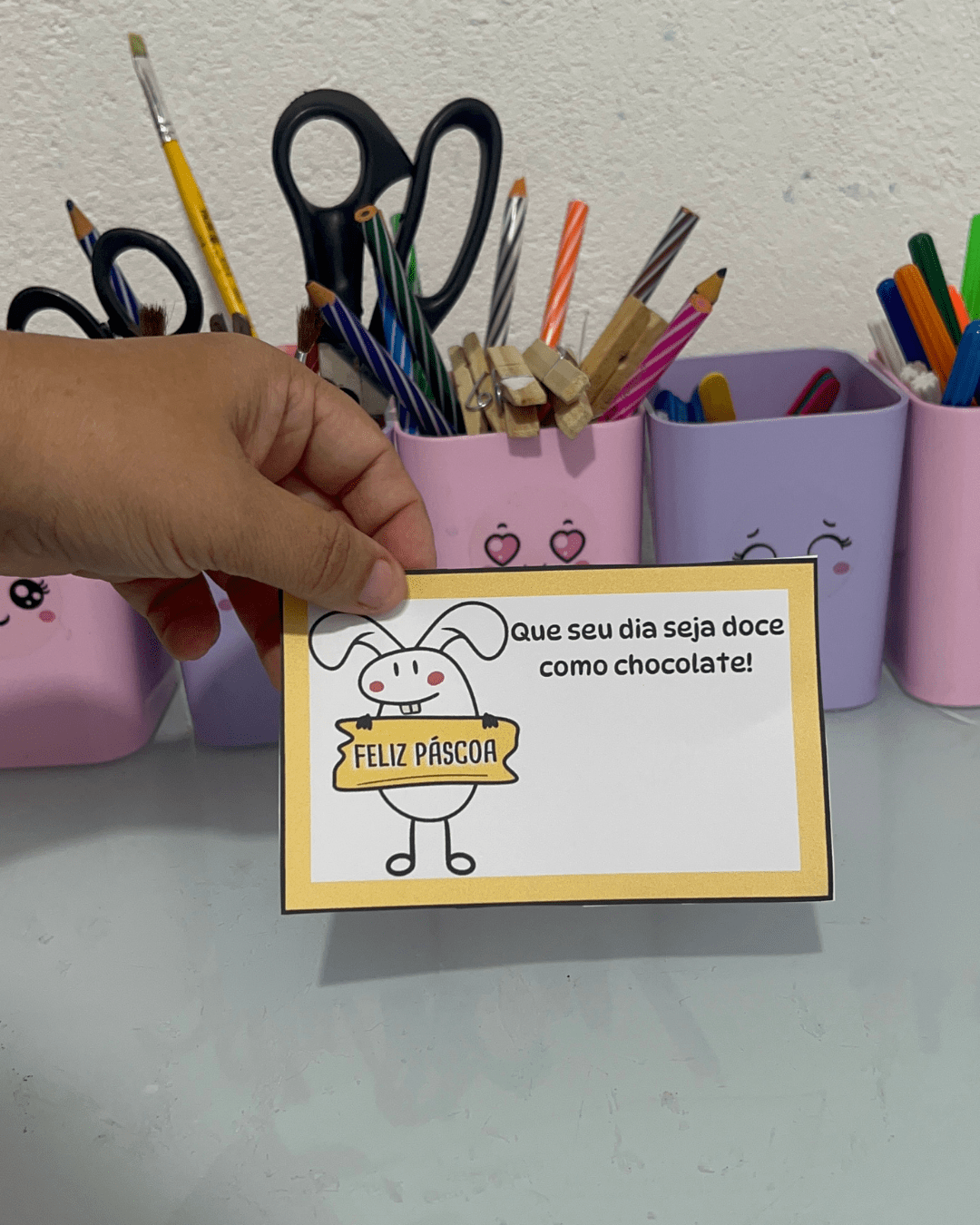 Sugerir que as crianças escrevam o nome e uma frase simples como “Feliz Páscoa!” ou “Com carinho, [nome]”.