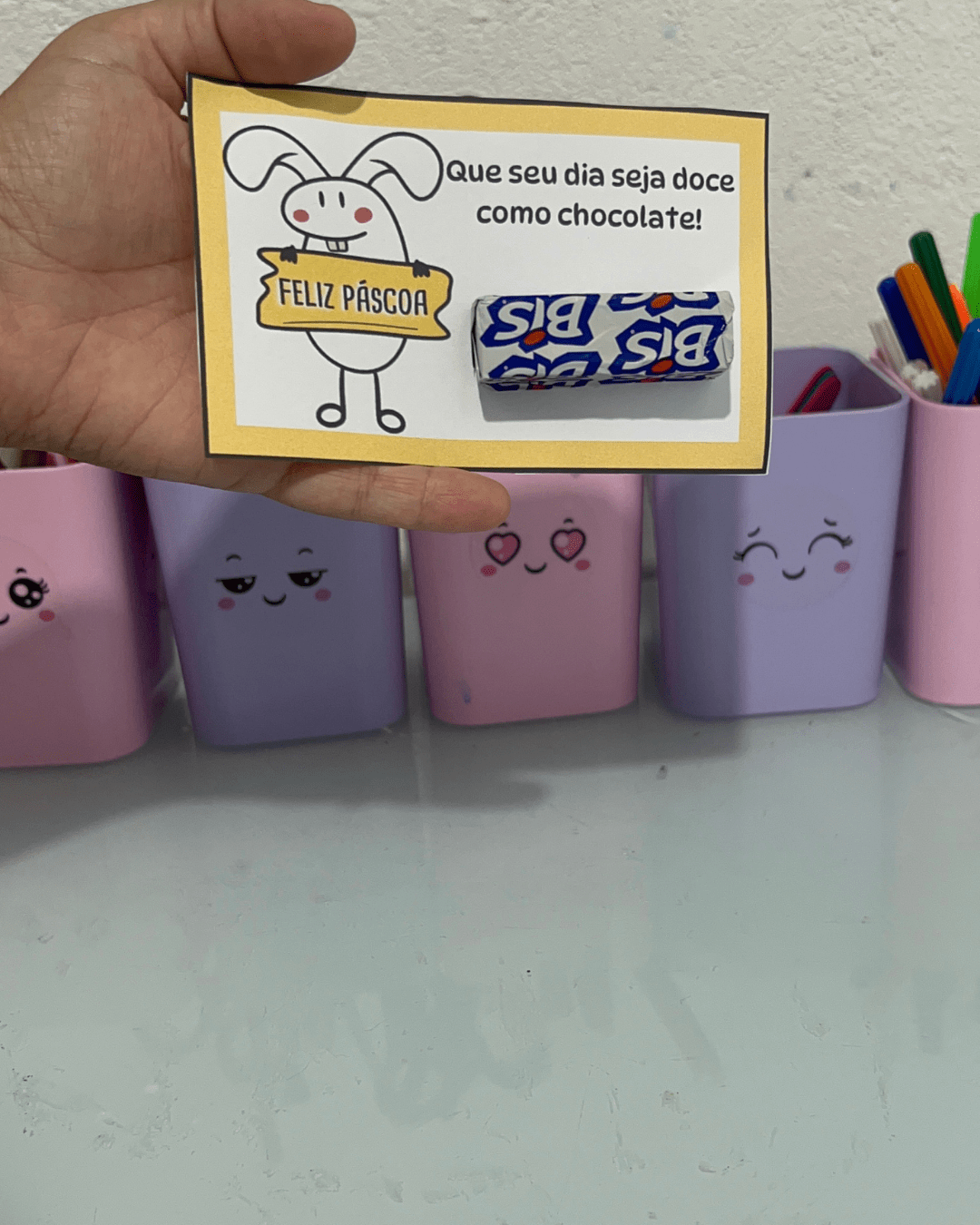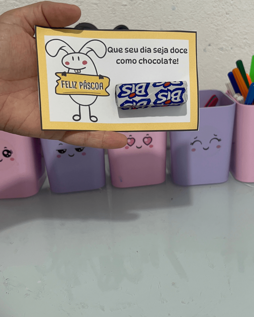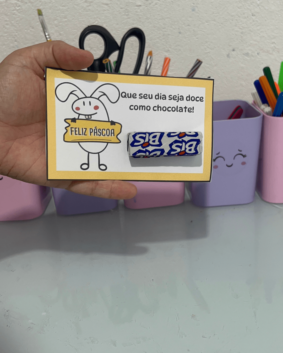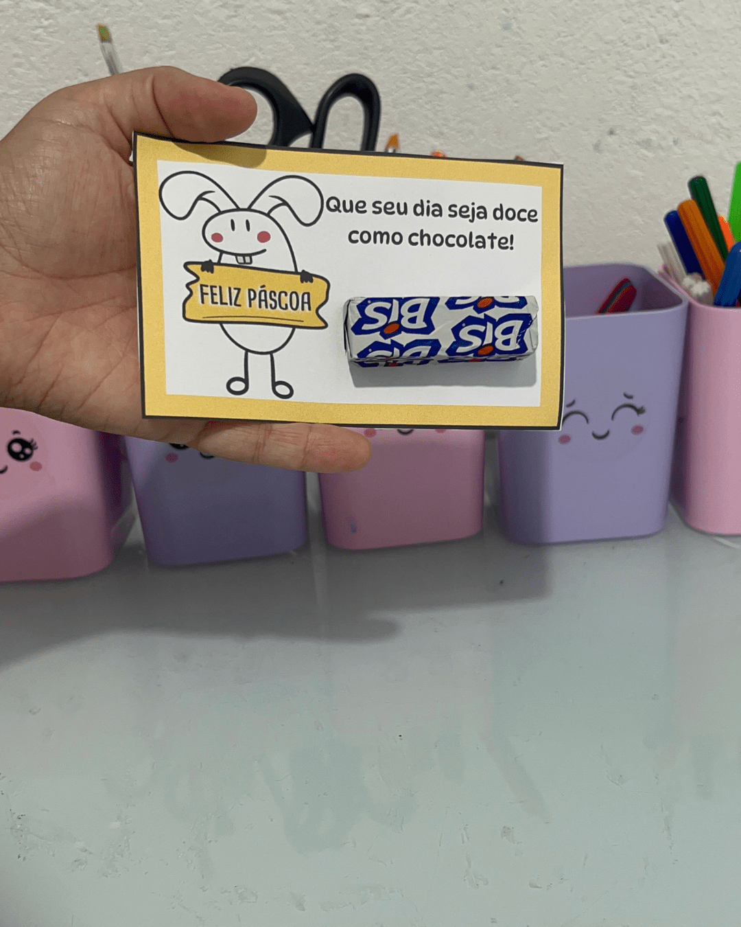 Sugerir que as crianças escrevam o nome e uma frase simples como “Feliz Páscoa!” ou “Com carinho, [nome]”.