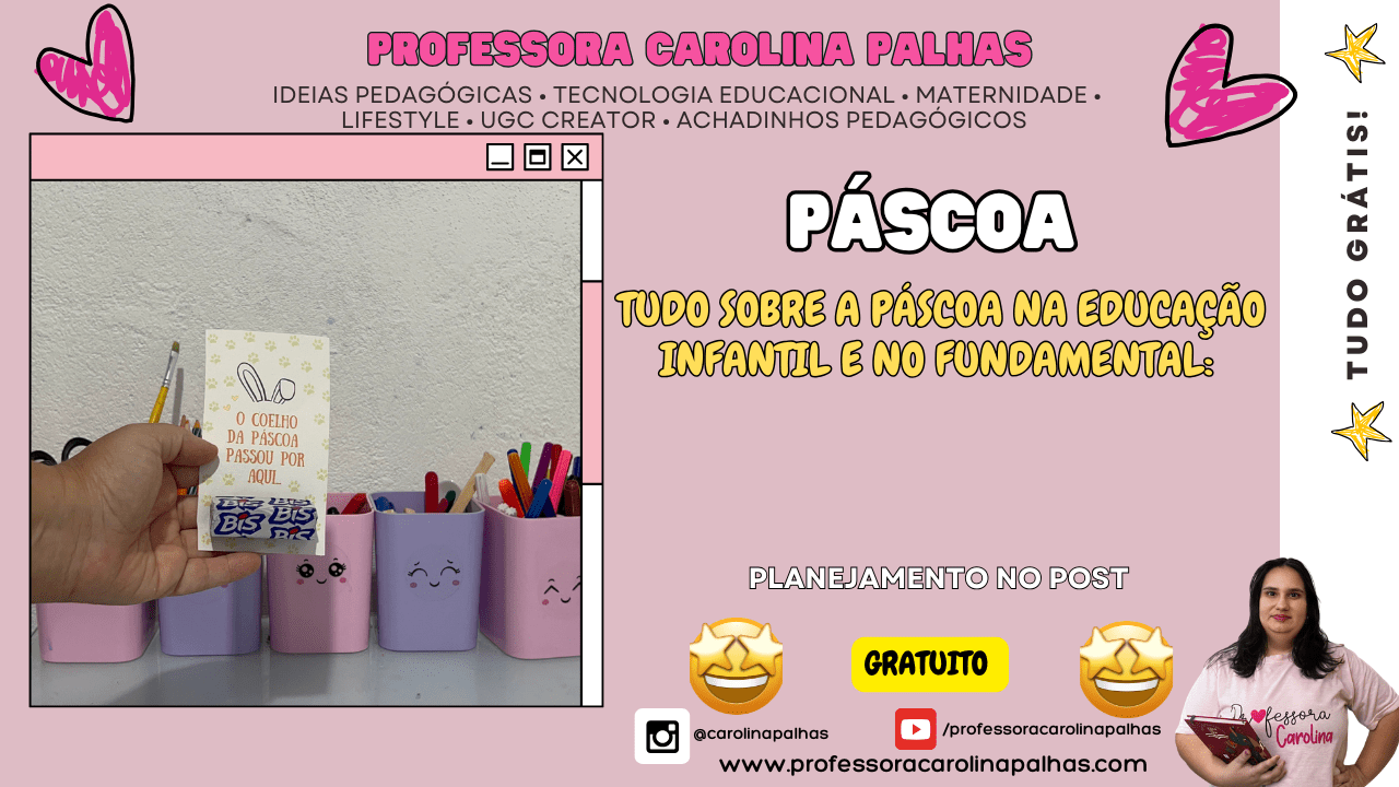 Se você é professora, mãe, coordenadora ou trabalha com crianças da Educação Infantil e dos Anos Iniciais do Ensino Fundamental, prepare-se para viver uma experiência inesquecível com as crianças! O SUPER KIT PEDAGÓGICO DE PÁSCOA foi criado com muito carinho e profissionalismo pela Professora Carolina Palhas, reunindo materiais pedagógicos lúdicos, criativos e 100% alinhados à BNCC.