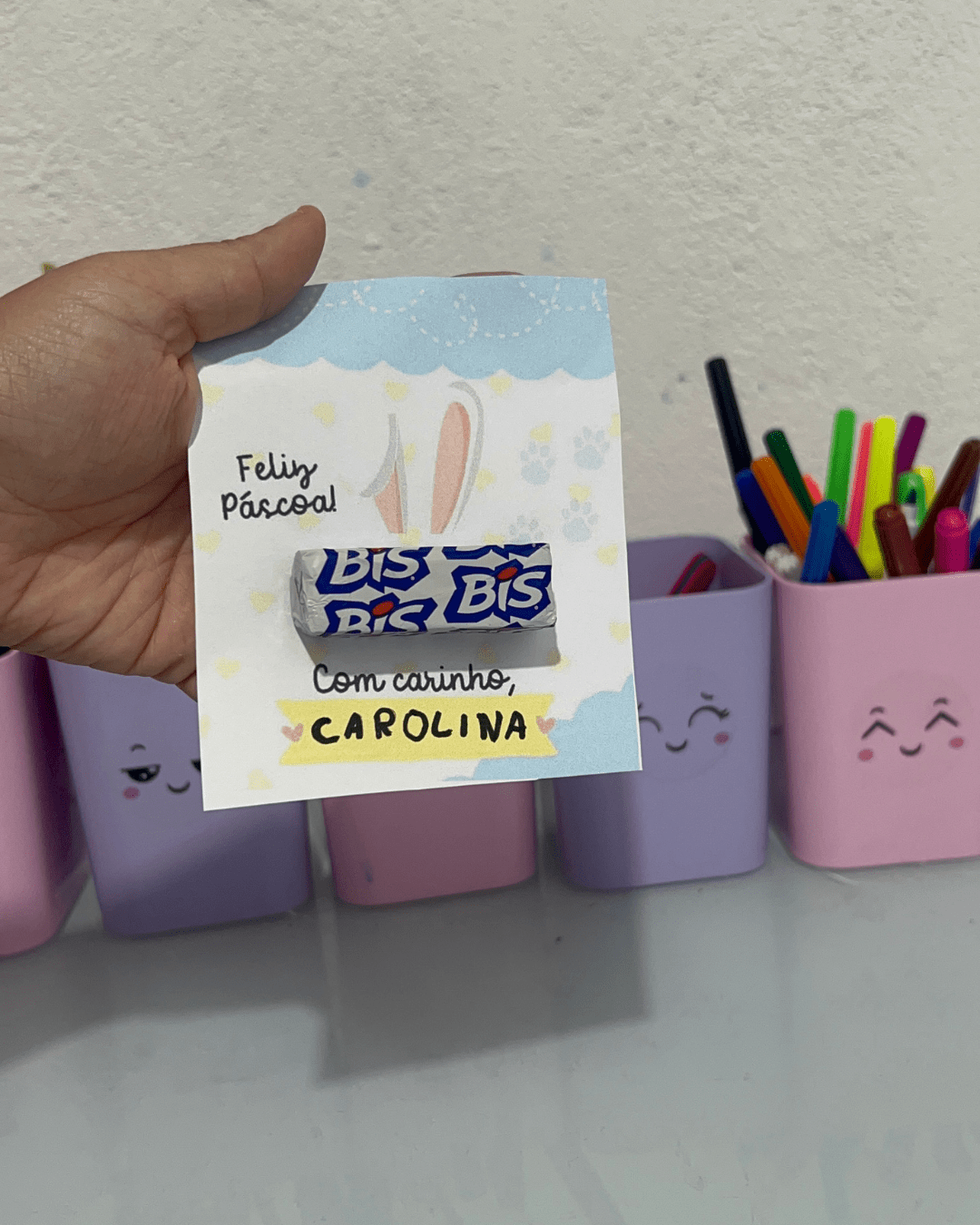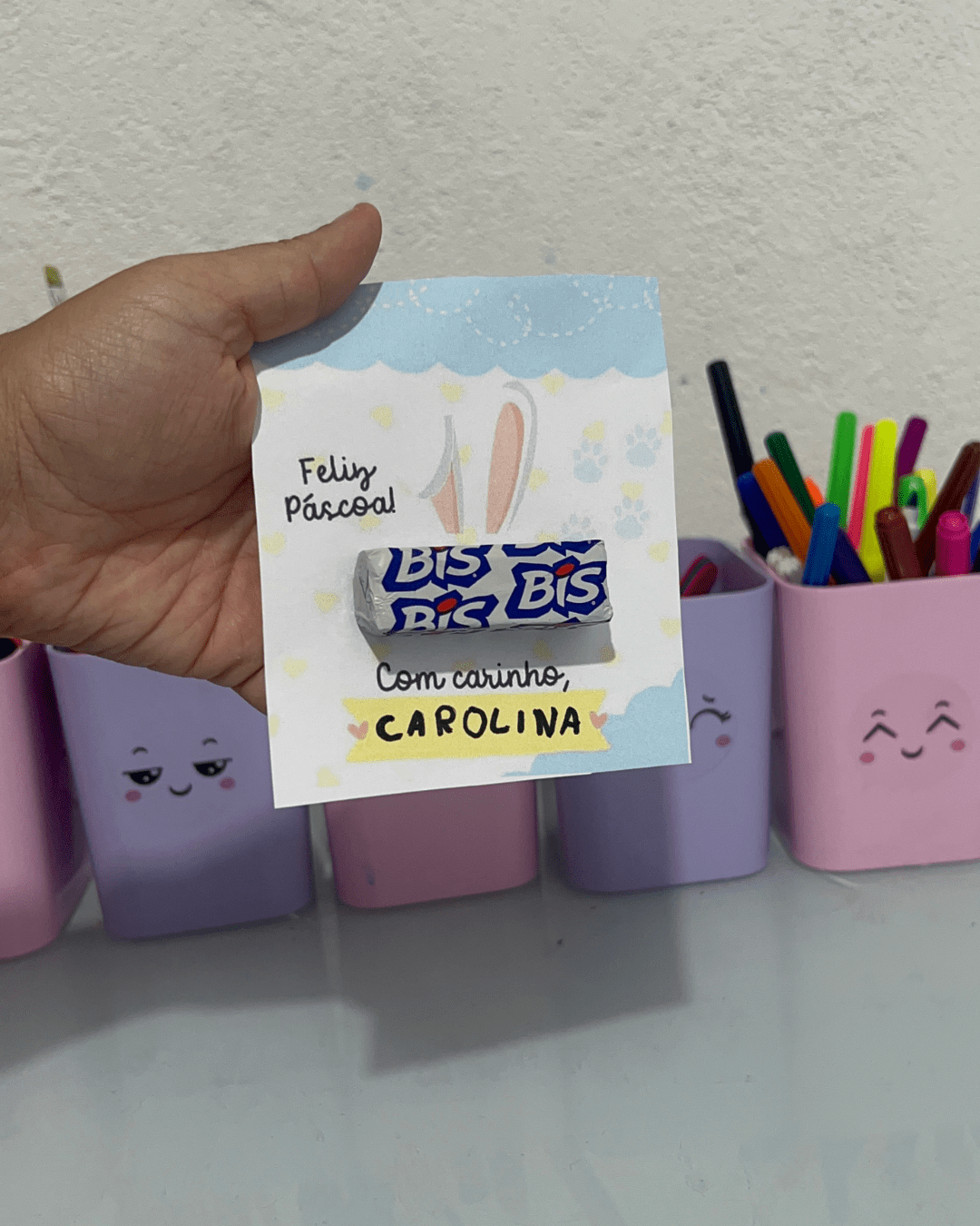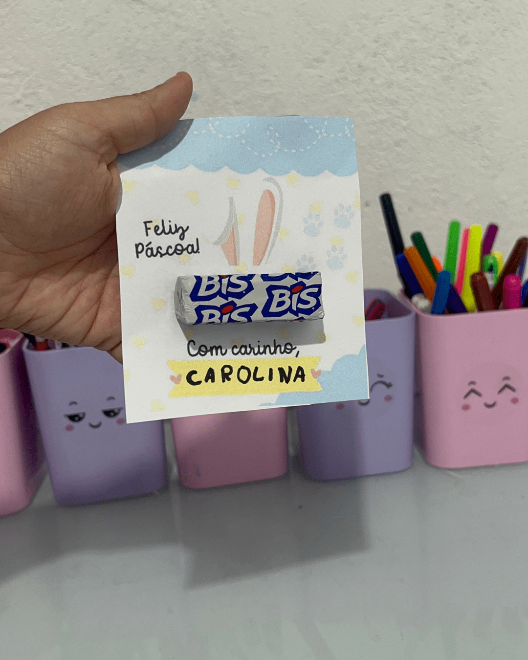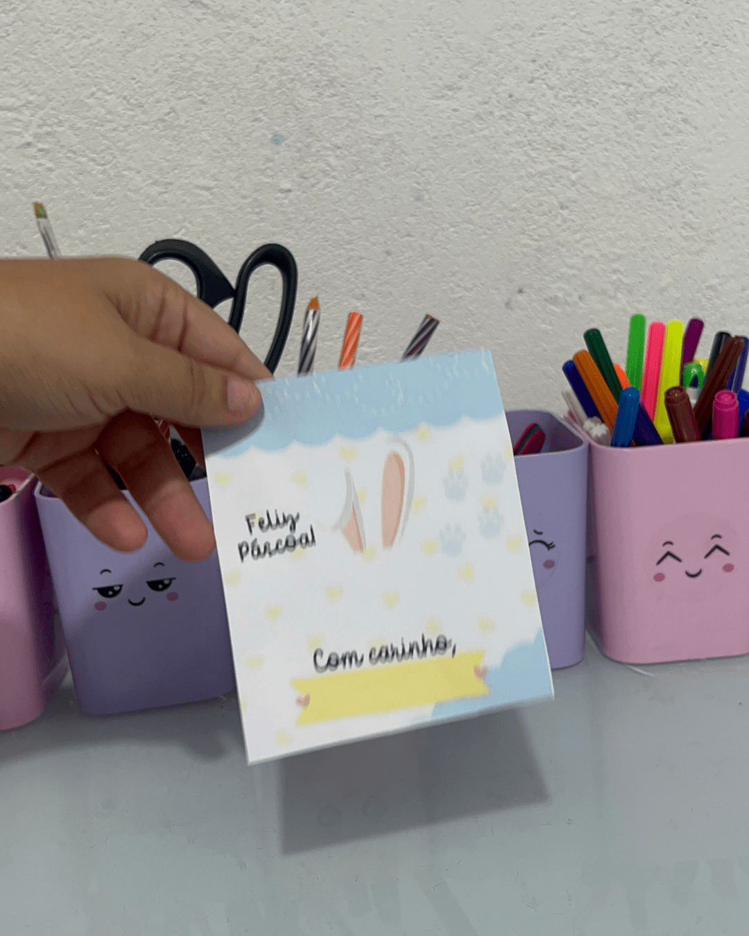 Sugerir que as crianças escrevam o nome e uma frase simples como “Feliz Páscoa!” ou “Com carinho, [nome]”.