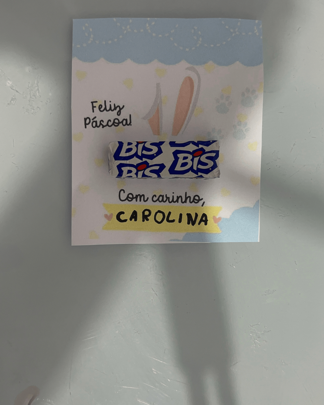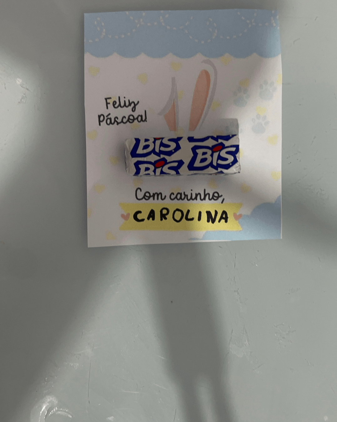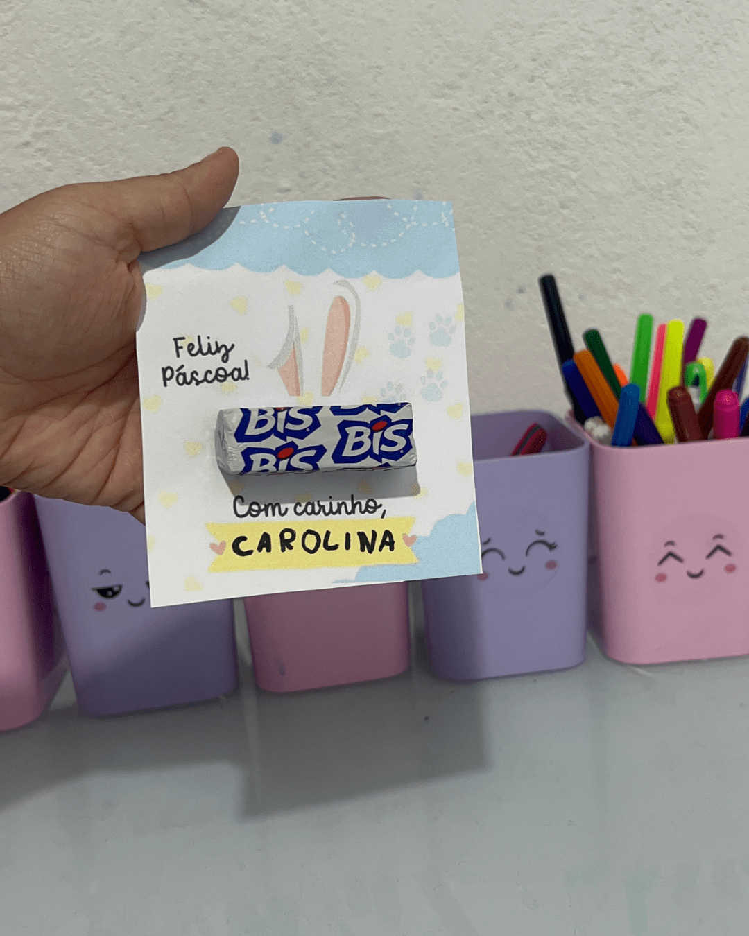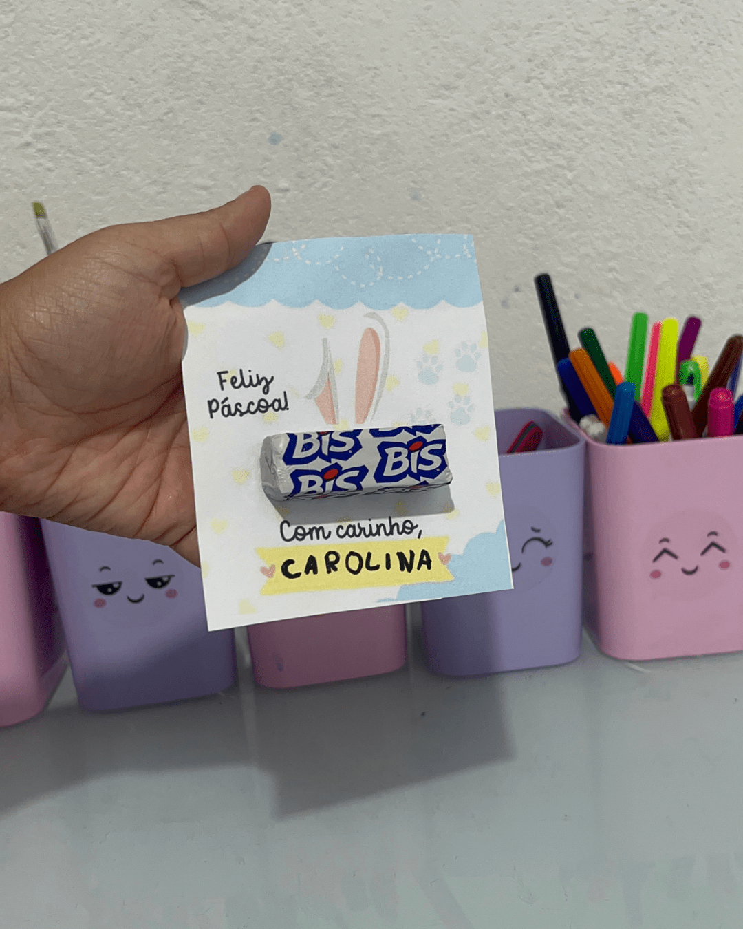 Sugerir que as crianças escrevam o nome e uma frase simples como “Feliz Páscoa!” ou “Com carinho, [nome]”.
