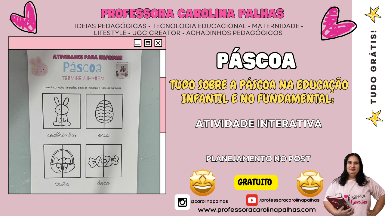 Se você é professora, mãe, coordenadora ou trabalha com crianças da Educação Infantil e dos Anos Iniciais do Ensino Fundamental, prepare-se para viver uma experiência inesquecível com as crianças! O SUPER KIT PEDAGÓGICO DE PÁSCOA foi criado com muito carinho e profissionalismo pela Professora Carolina Palhas, reunindo materiais pedagógicos lúdicos, criativos e 100% alinhados à BNCC.