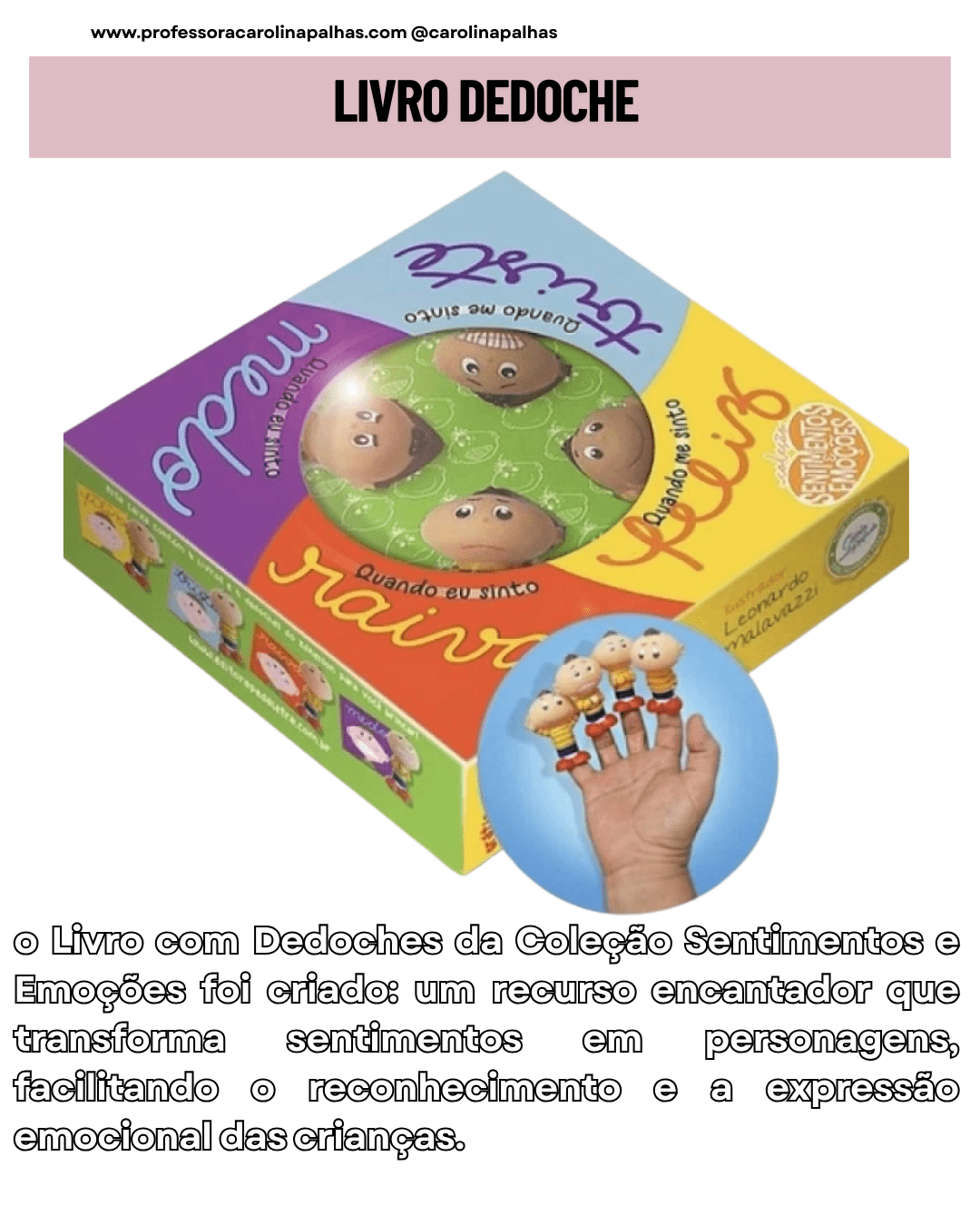 Transformar sentimentos em personagens ajuda no reconhecimento e na expressão das emoções. Esse livro vem com dedoches que representam diferentes sentimentos.