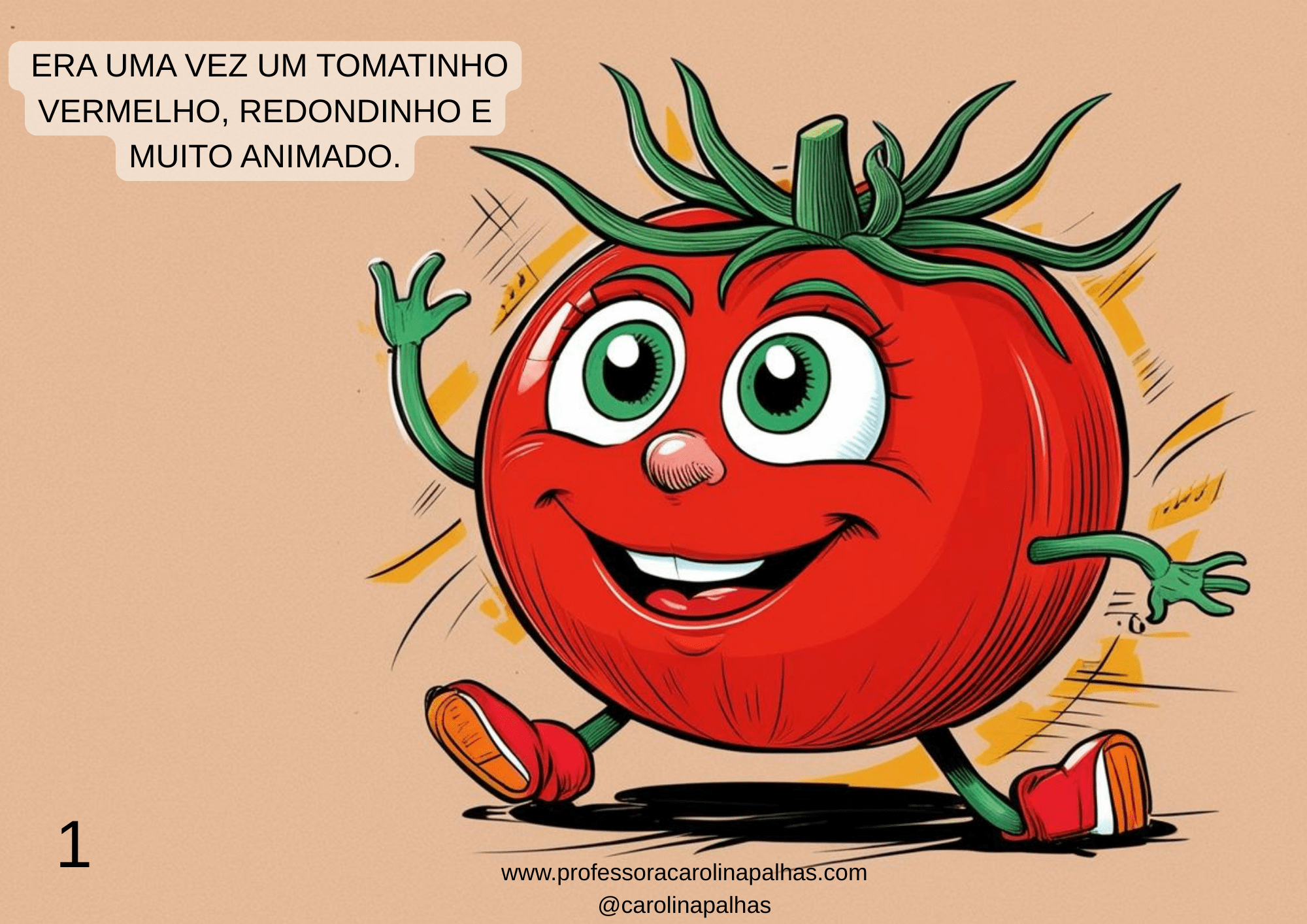 Página 1: Era uma vez um Tomatinho vermelho, redondinho e muito animado.