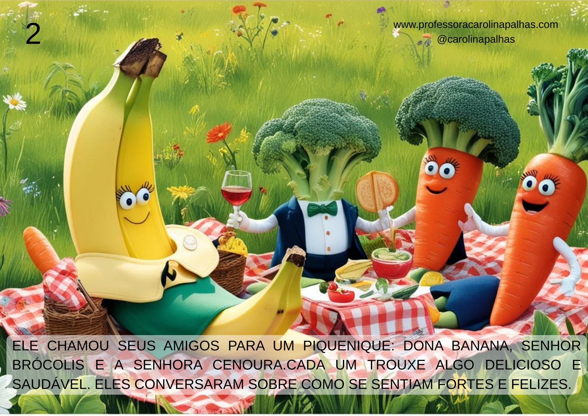 Página 2: Ele chamou seus amigos para um piquenique: Dona Banana, Senhor Brócolis e a Senhora Cenoura.