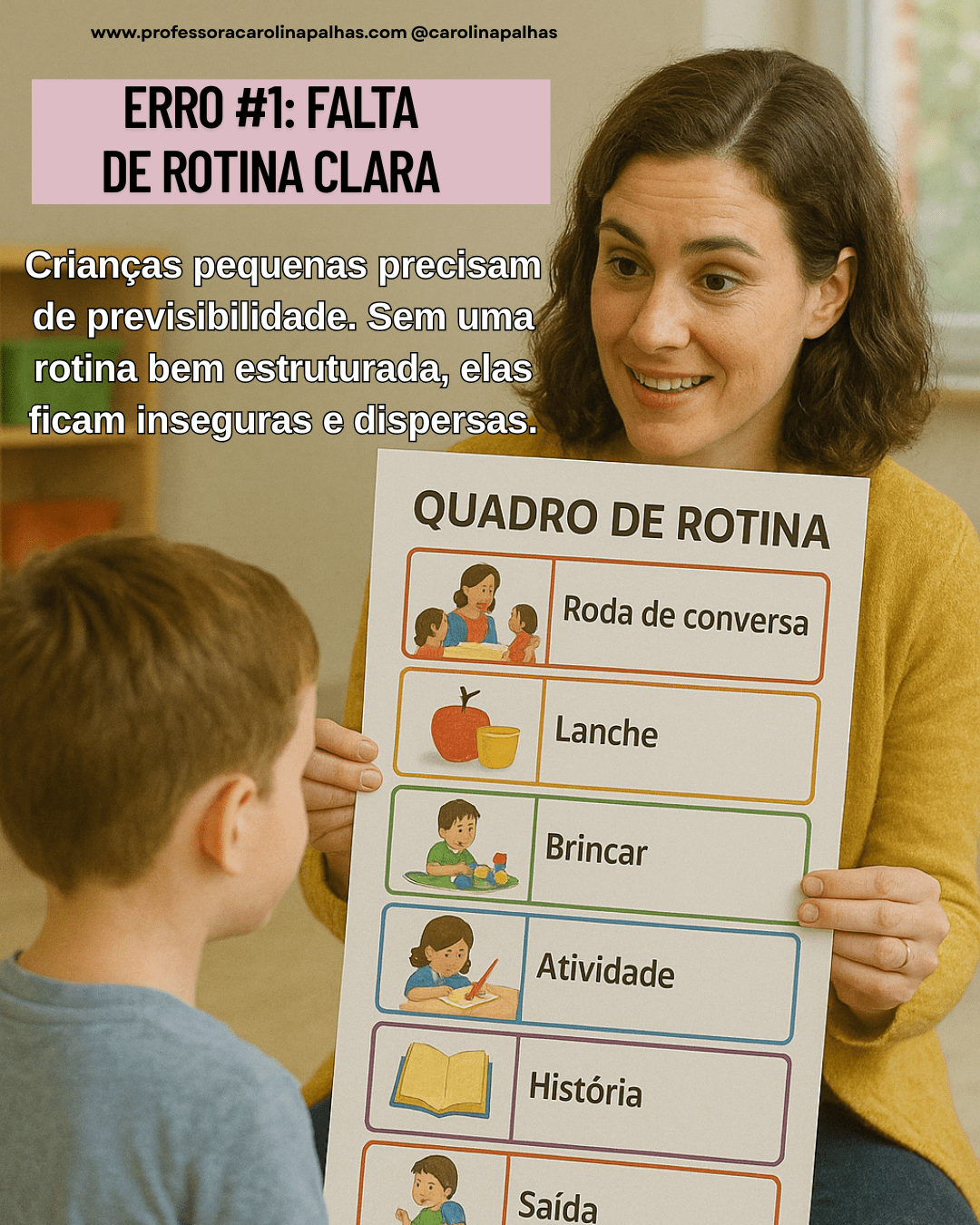 Consequências: Insegurança, desatenção e desinteresse. Solução: Utilize um quadro de rotina visual com imagens e repita as sequências todos os dias. Objetivo: Promover previsibilidade e autonomia.