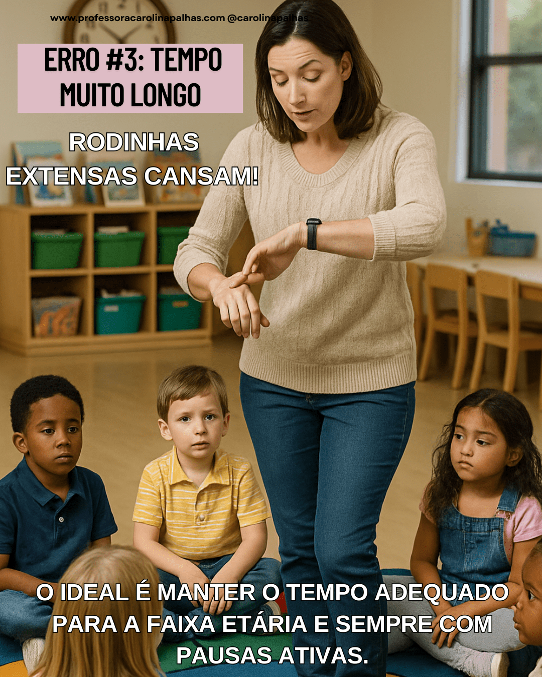 Consequências: Cansaço, impaciência e dispersão. Solução: Adapte o tempo da rodinha à faixa etária (10 a 20 minutos). Objetivo: Garantir foco e engajamento.