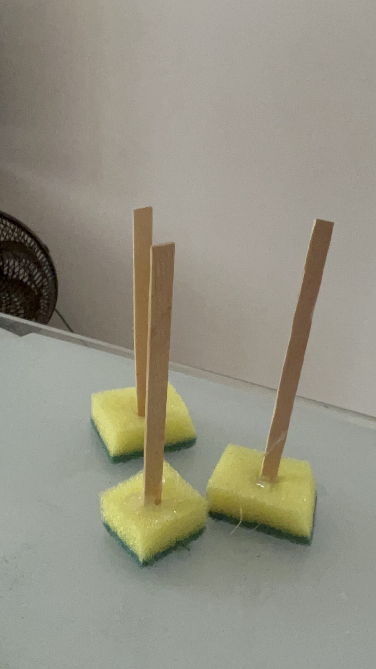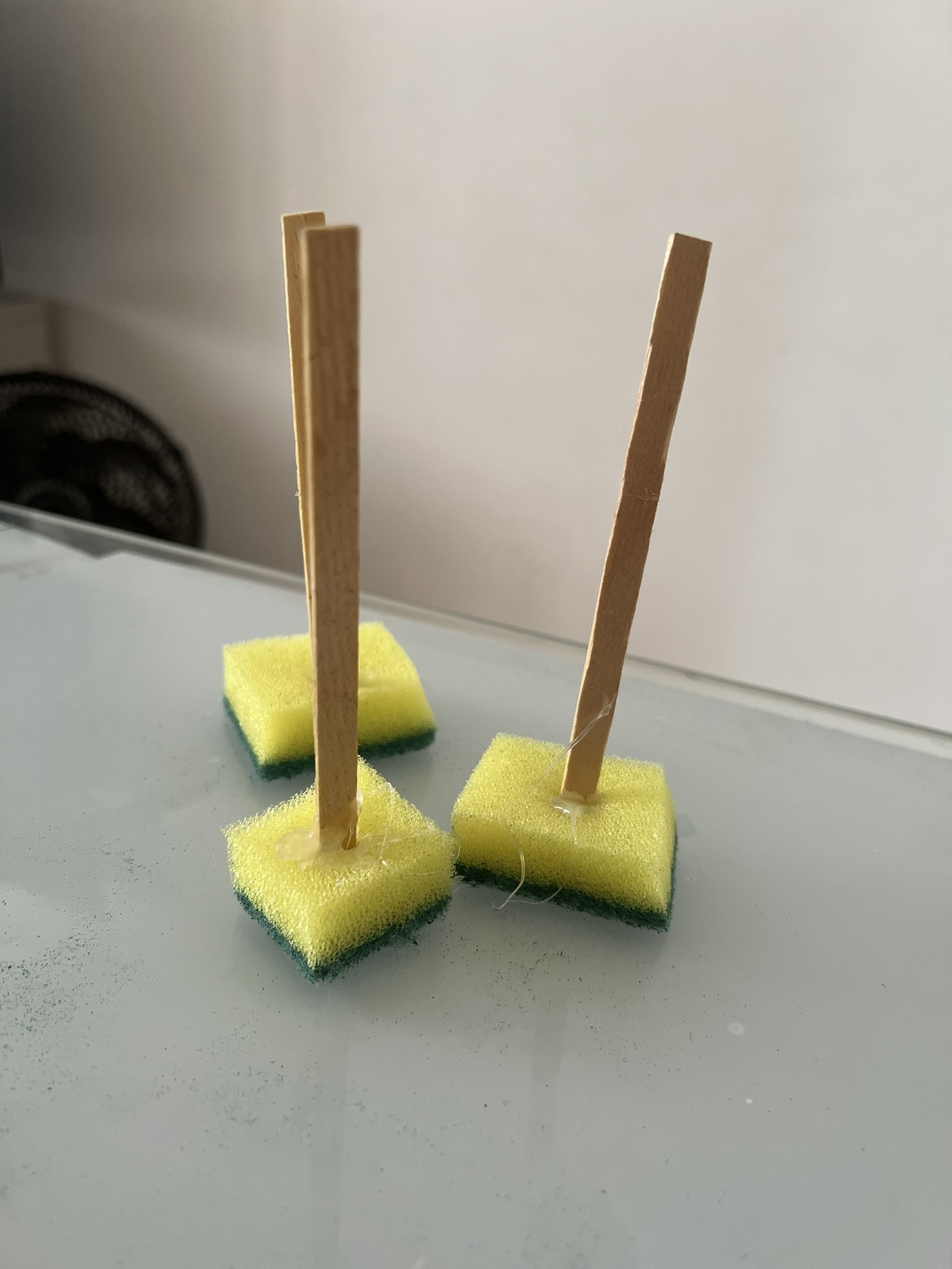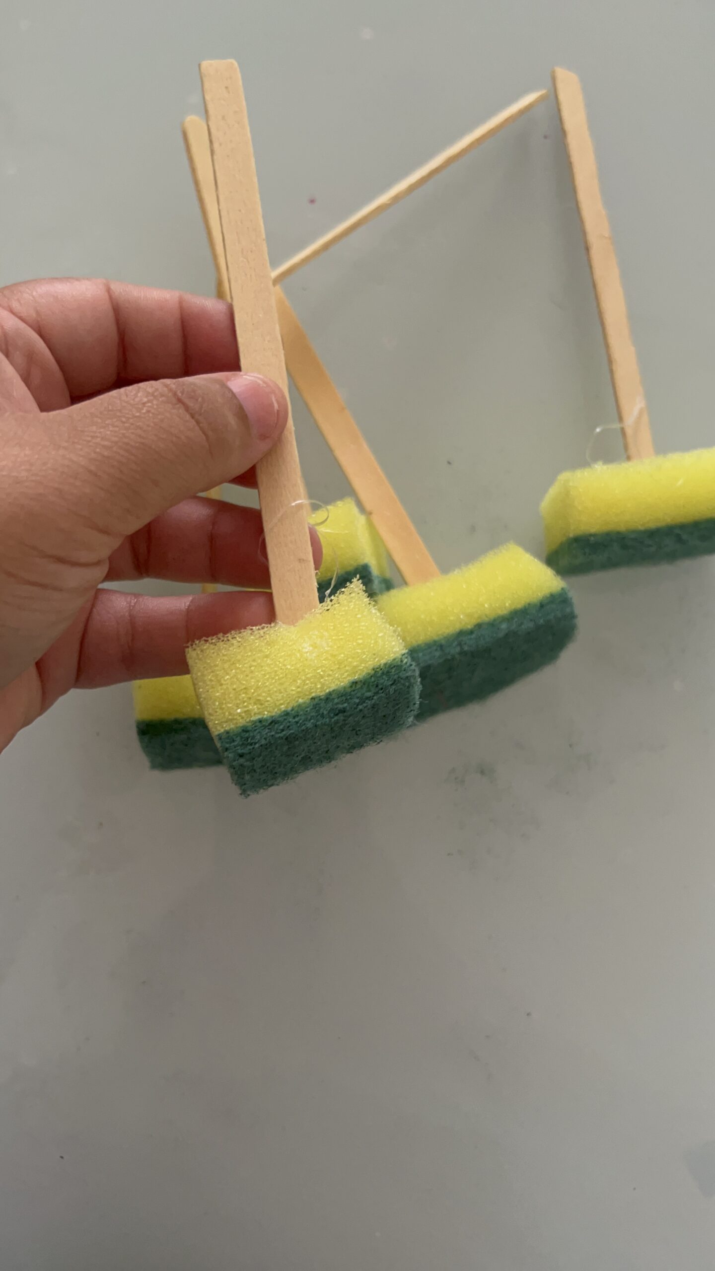 Basta cortar um pedacinho da bucha, colar o palito na parte amarela e esperar secar. Pronto! Um pincel resistente, lavável e que as crianças vão adorar usar.
