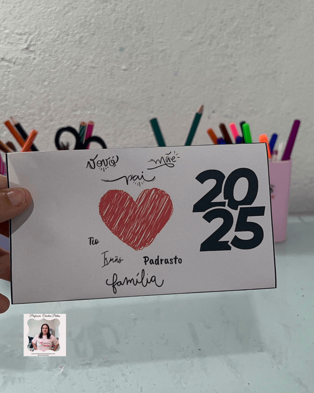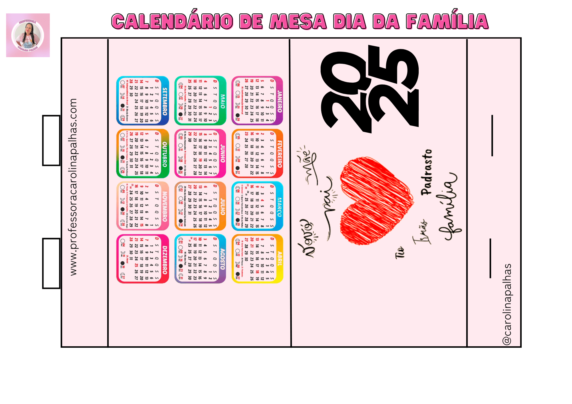 O calendário de mesa “Quem Cuida de Mim” é mais do que uma lembrancinha fofa. É um recurso pedagógico cheio de propósito e afeto. Ele traz os meses do ano ilustrados com desenhos e frases carinhosas sobre cuidado, afeto e vínculos. Em cada mês, a criança pode colar uma foto, fazer um desenho ou escrever (com ajuda) o nome de alguém especial que cuida dela: mãe, pai, avós, tios, professoras, irmãos, vizinhos e muito mais.