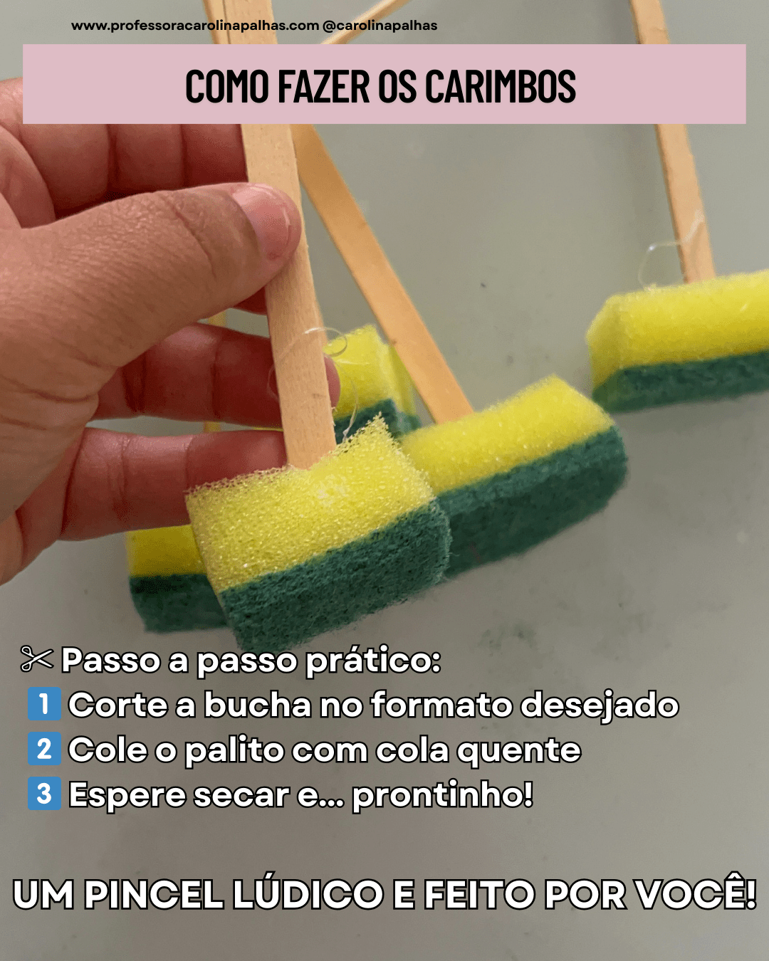 - Preparação dos Materiais: Corte a bucha em pequenos pedaços que possam ser facilmente manuseados pelas crianças. Fixe cada pedaço de bucha em um palito de picolé para criar um carimbo.