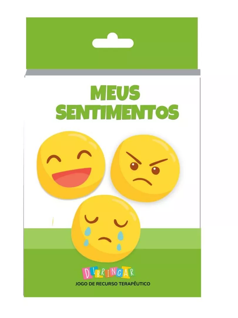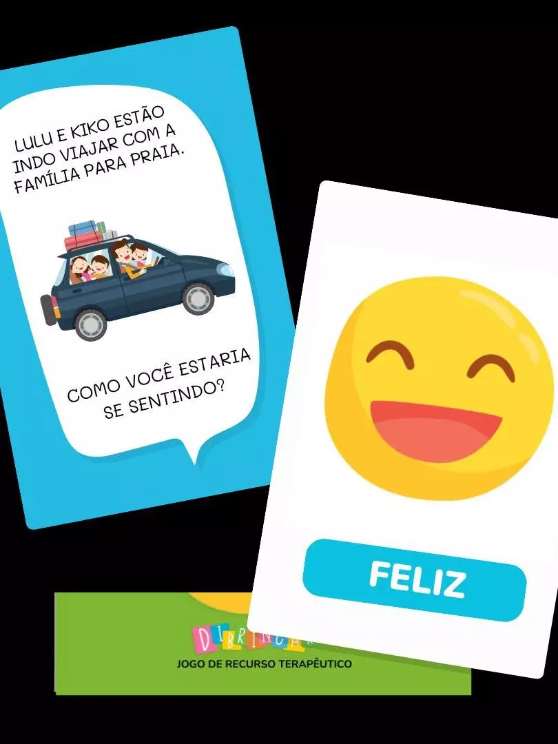 É um jogo de recurso terapêutico composto por cartas que apresentam situações do cotidiano infantil acompanhadas de imagens e emojis representando diferentes emoções. A criança deve associar a situação com o sentimento correspondente.