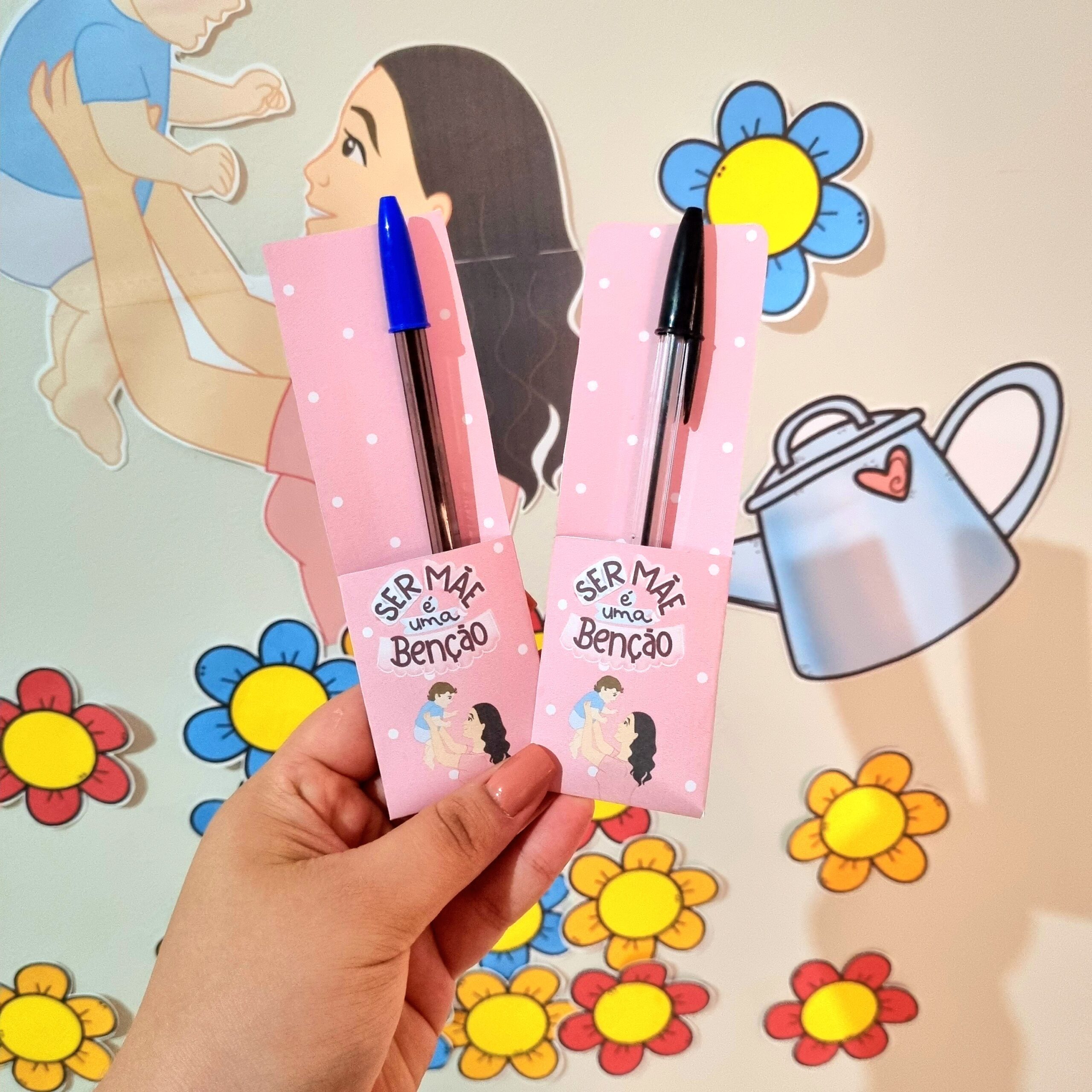 Como fazer: imprima o modelo, cole a caneta com fita dupla face e finalize com a frase: “Ser mãe é uma bênção!”