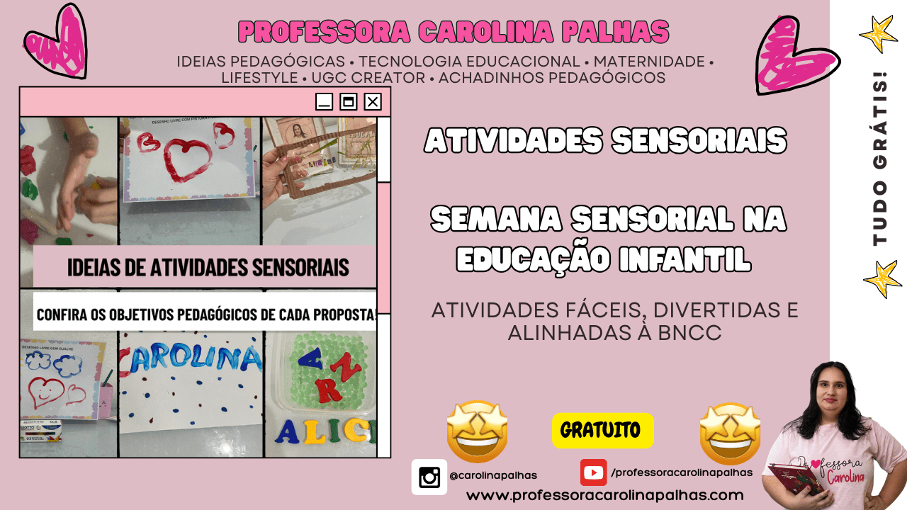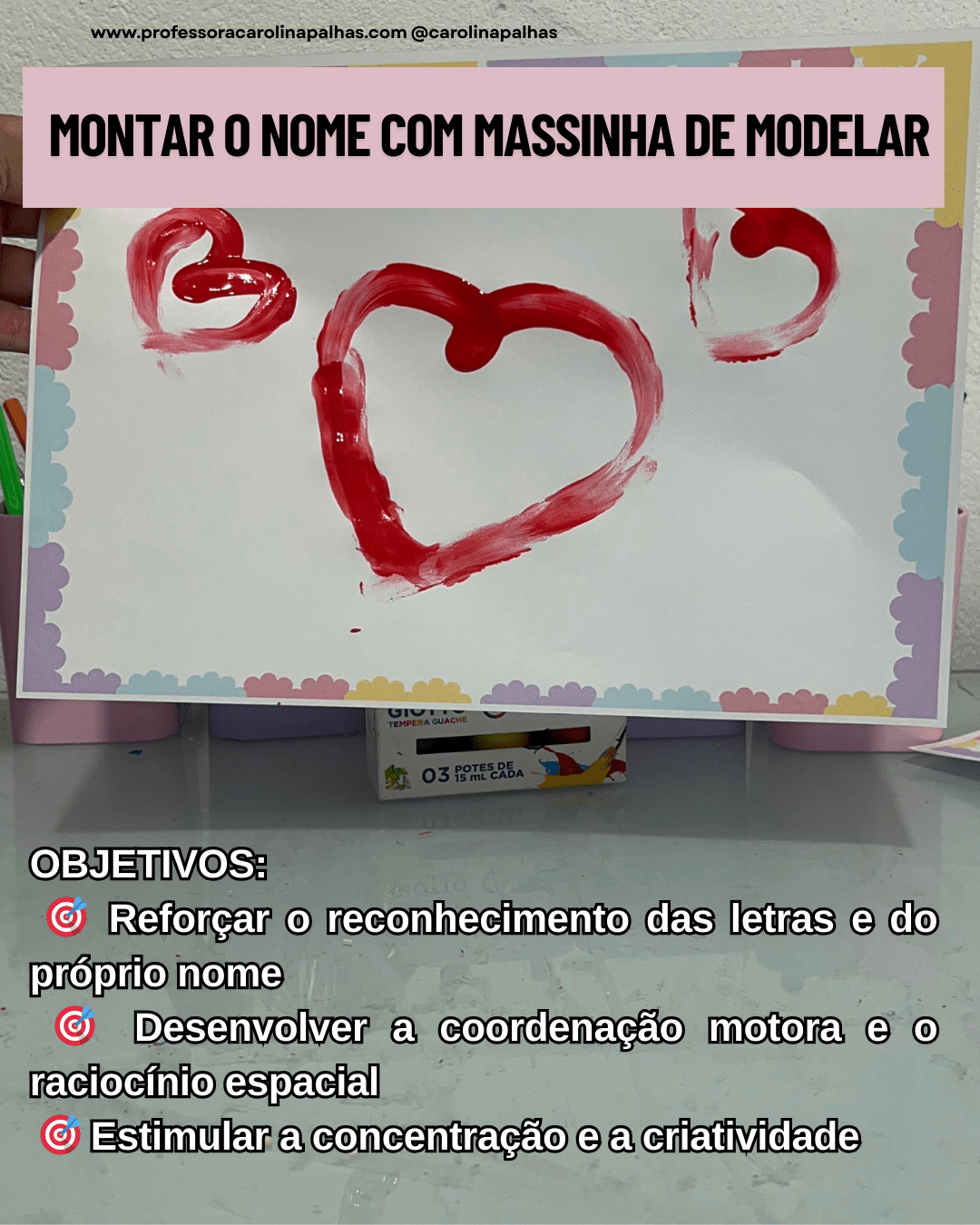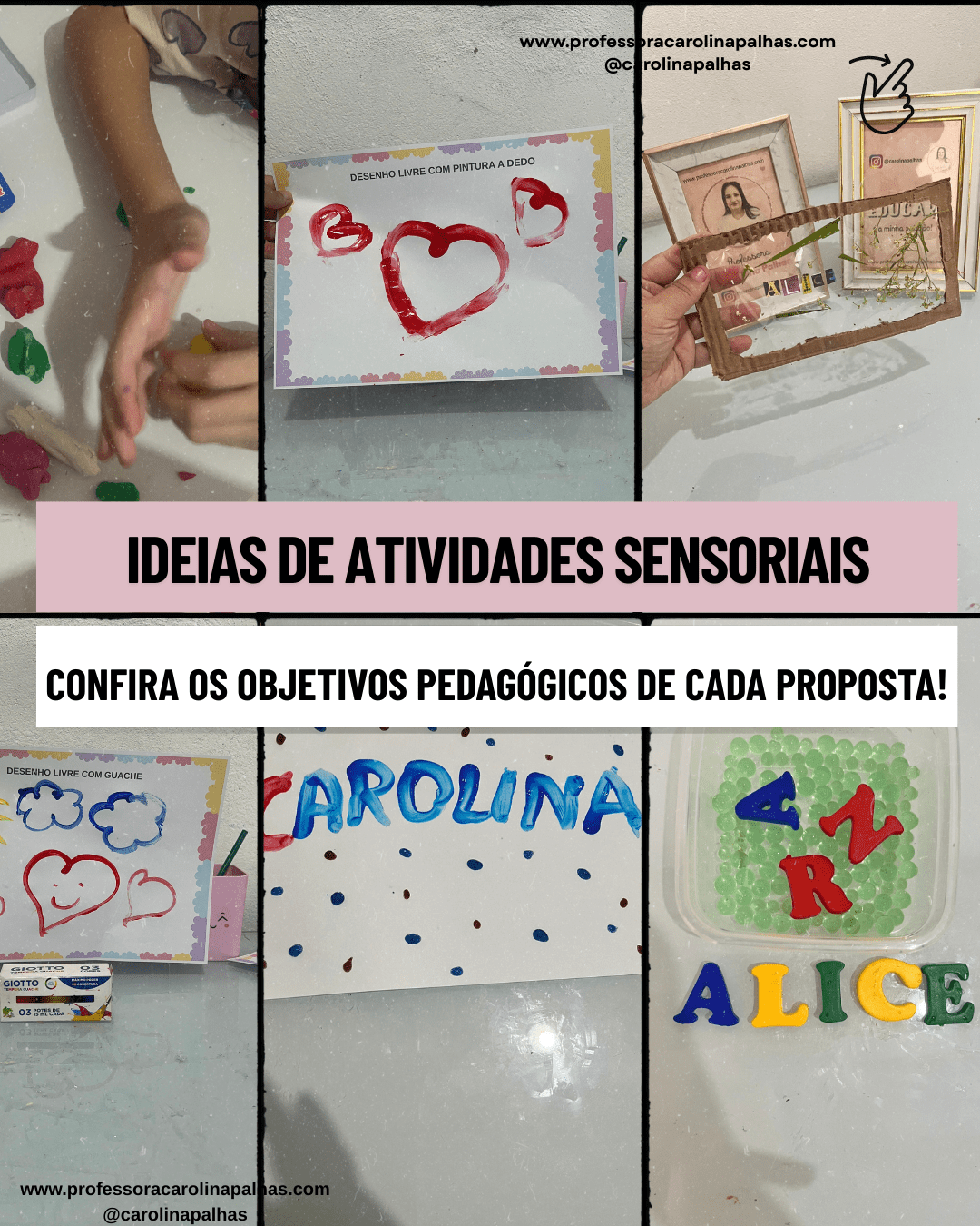 PALAVRAS-CHAVE: educação infantil, atividades sensoriais, planejamento semanal, BNCC, desenvolvimento infantil, coordenação motora, percepção tátil, alfabetização lúdica, atividades criativas, atividades com massinha, pintura com o dedo, letras em gel, nome com elementos da natureza, pedagogia criativa, plano de aula infantil
