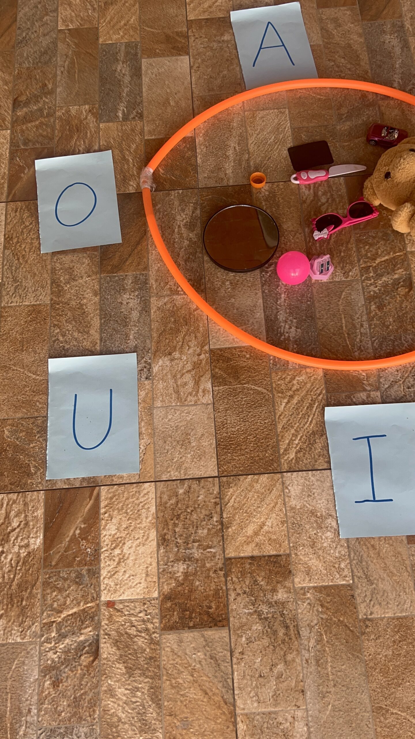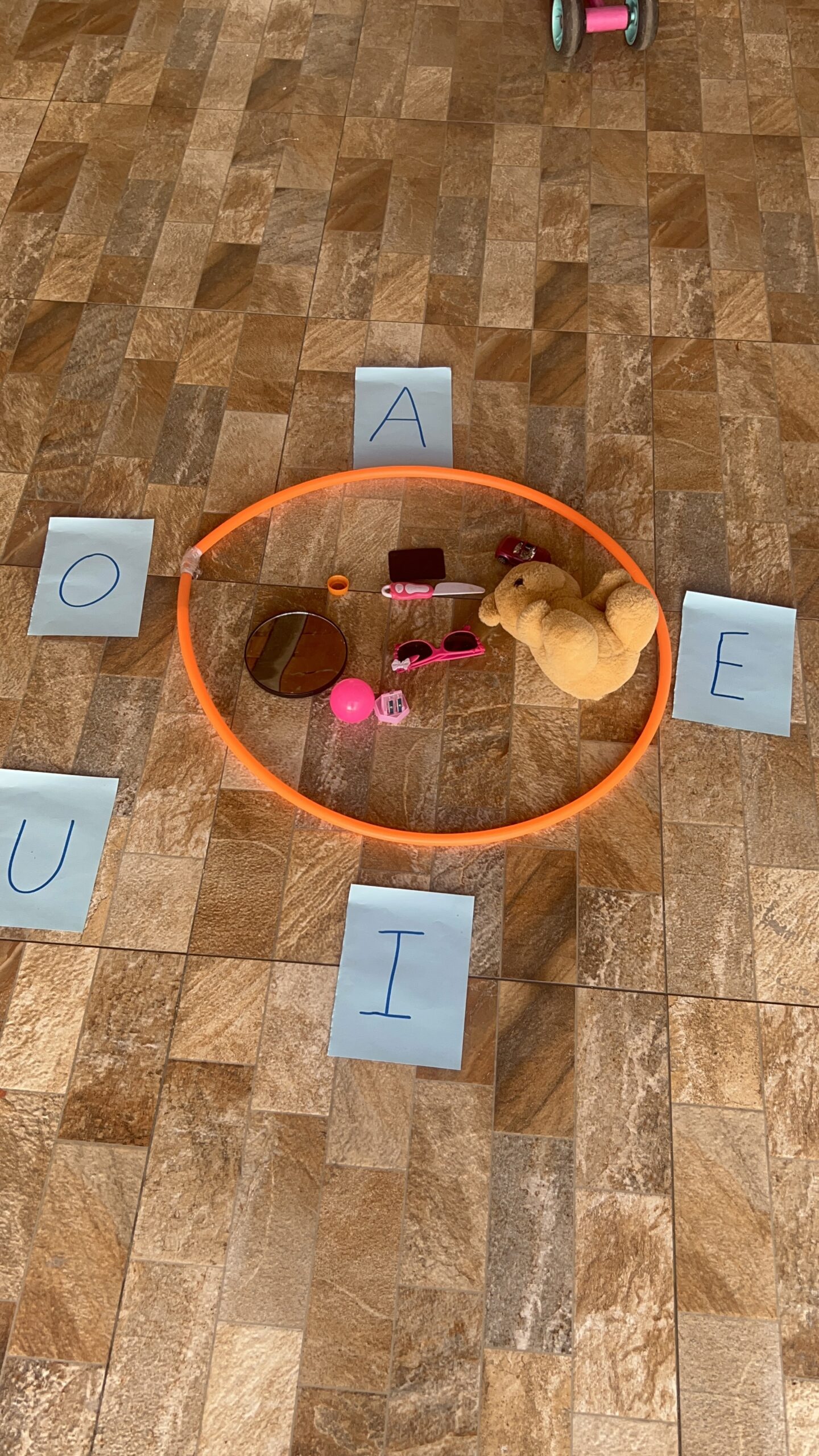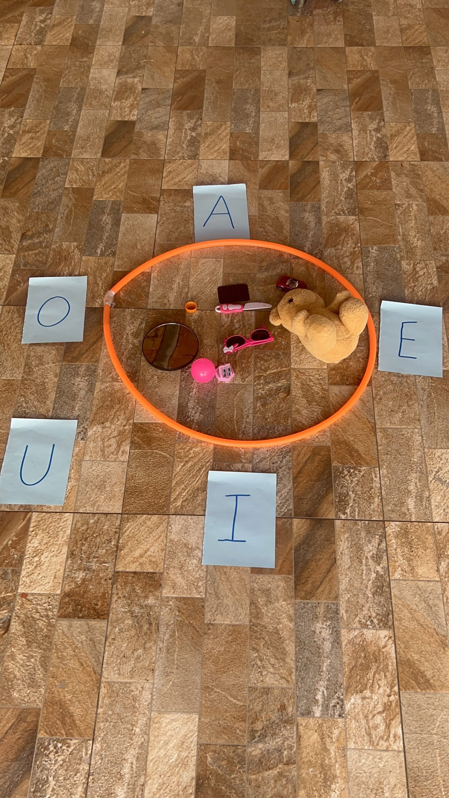 Permita que as crianças tragam objetos de casa com a vogal do dia.