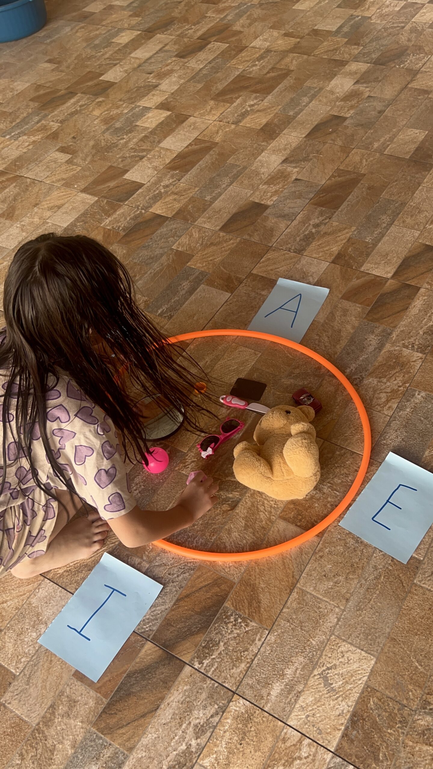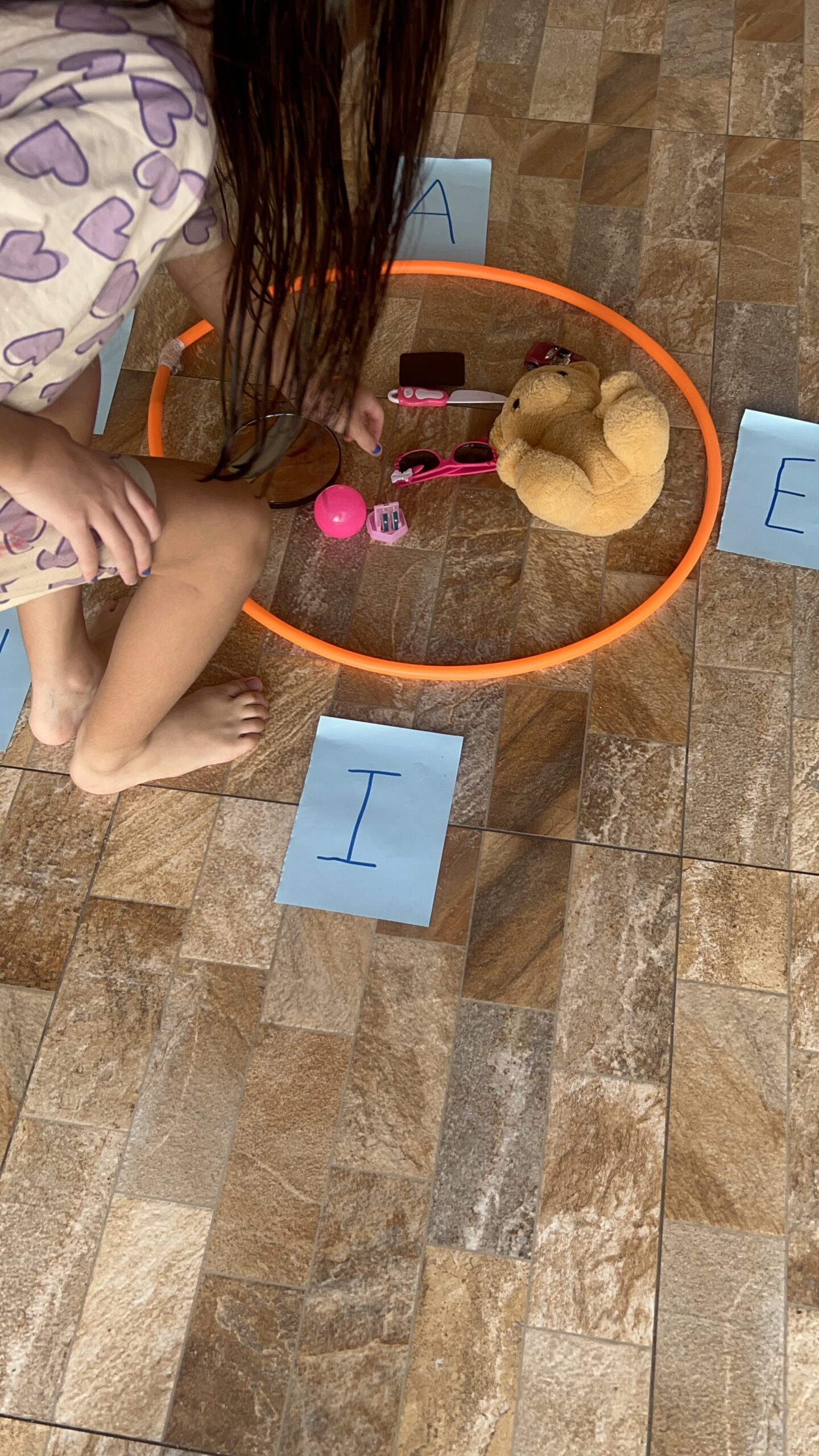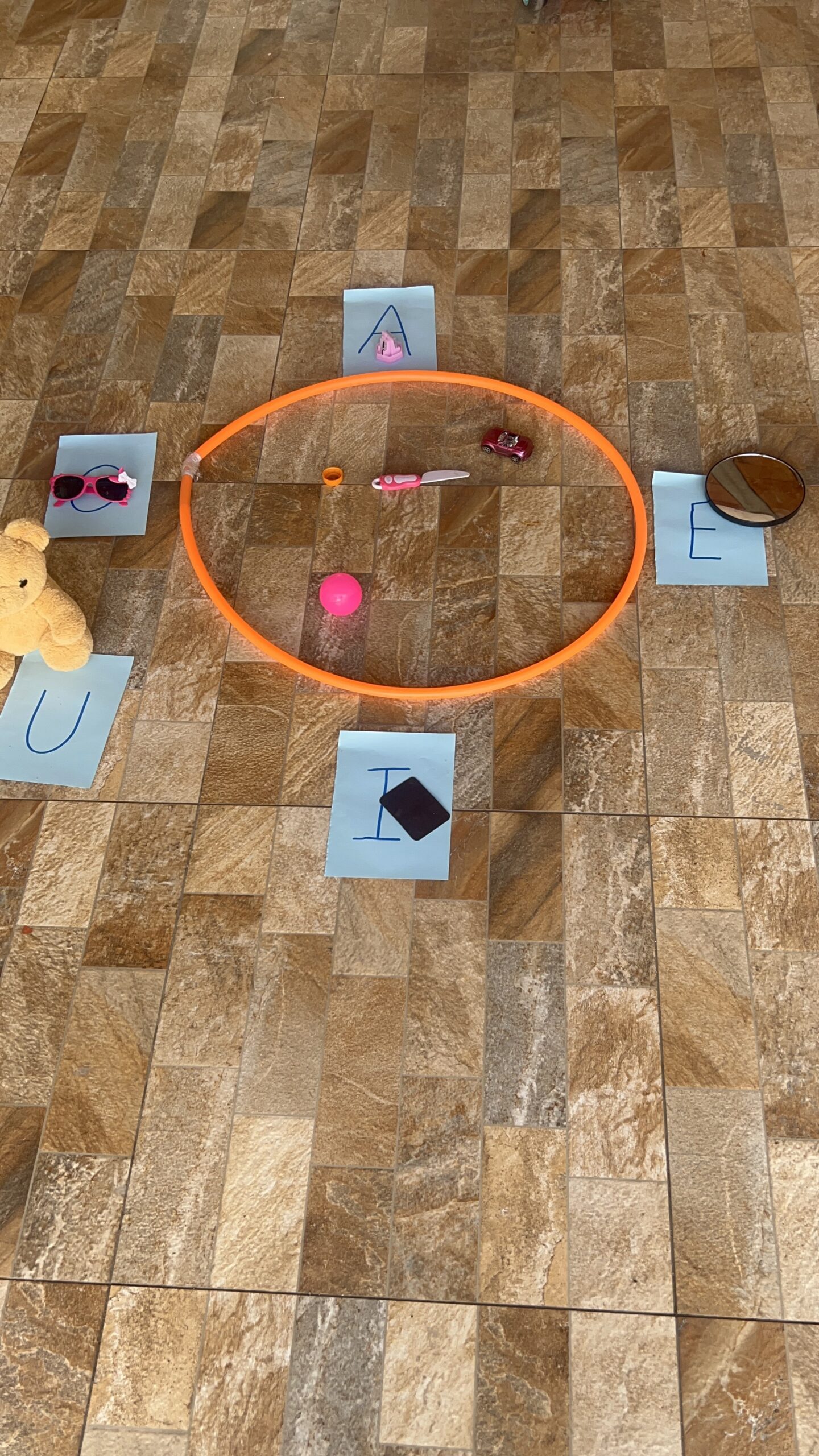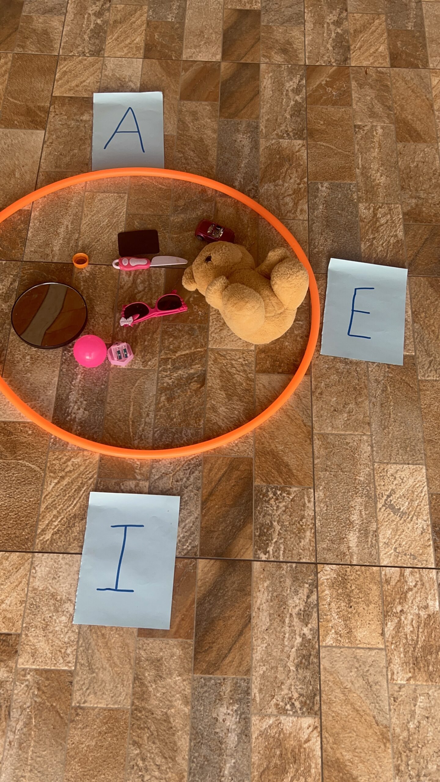 Permita que as crianças tragam objetos de casa com a vogal do dia.