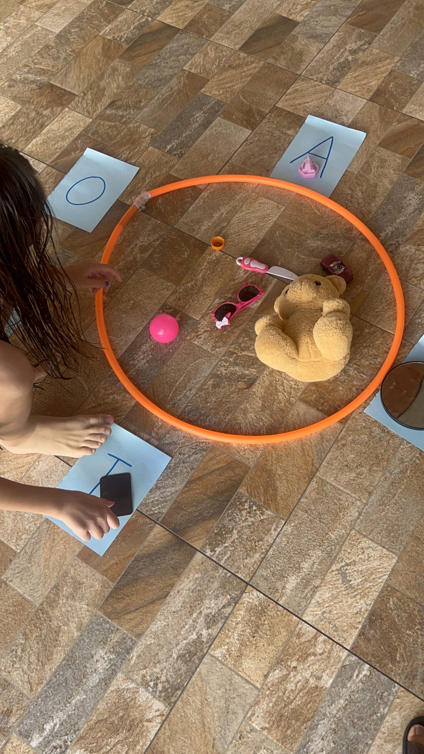 Caça ao objeto com A: as crianças procuram objetos no ambiente que começam com A (como “abacate”, “anel”, “água”).