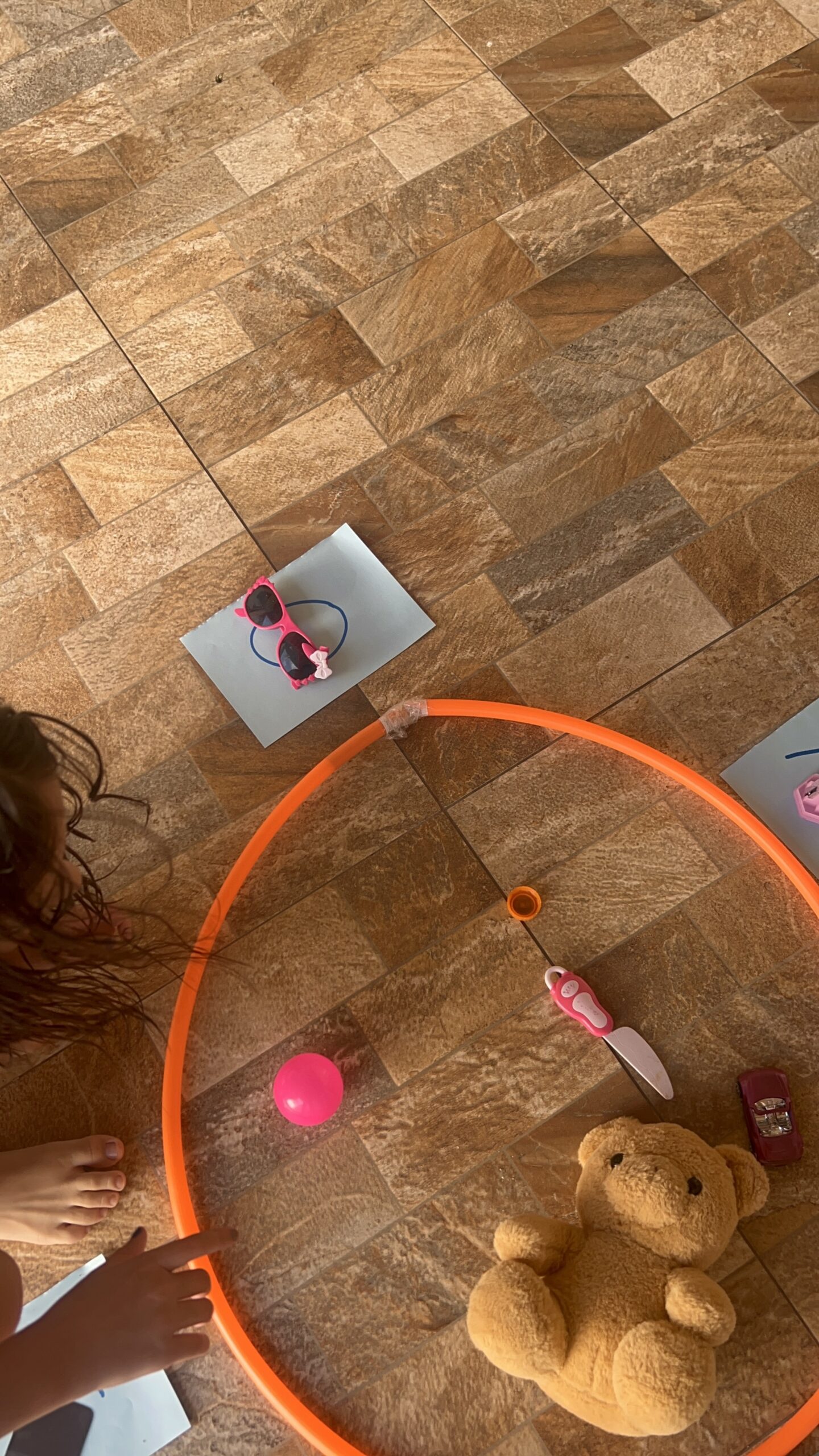 Obstáculo do O: circuito motor com bambolês, cordas e obstáculos.