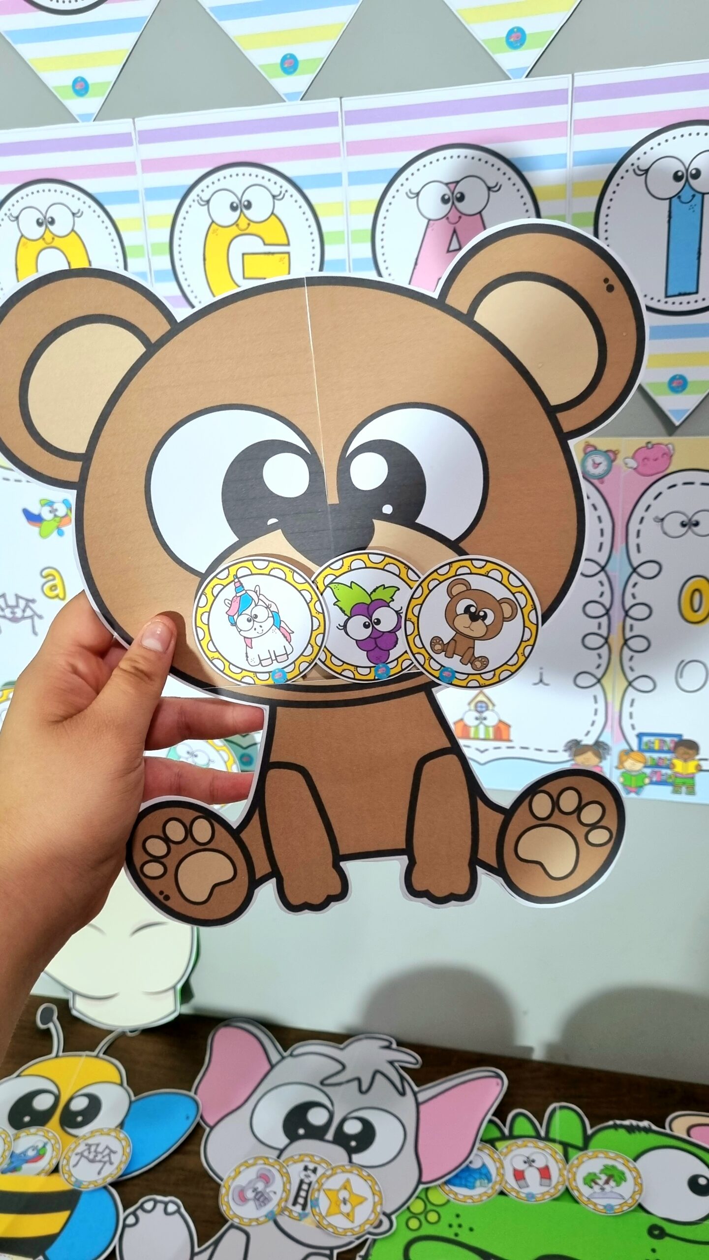 Por isso, usar recursos lúdicos, como o kit Festa das Vogais, potencializa a aprendizagem, porque combina movimento, escuta, fala, visão e interação social, criando memórias afetivas e facilitando a fixação das vogais.