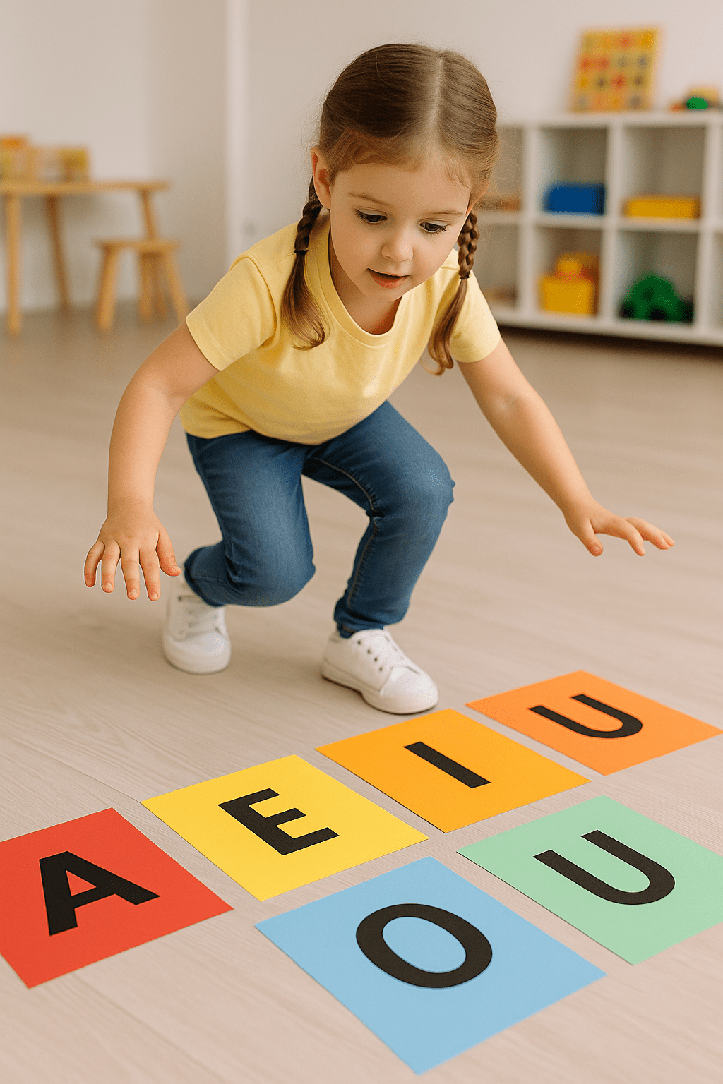 Monte um caminho com as letras A, E, I, O, U no chão usando fita ou EVA. As crianças percorrem o trajeto pulando e dizendo o som das letras.