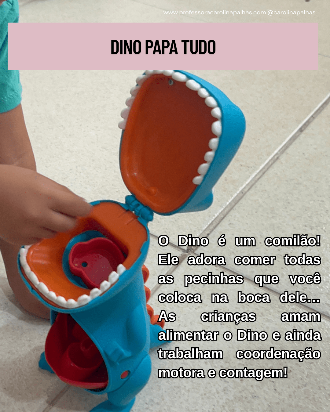 Palavras-chave: Dino Papa Tudo, brinquedo educativo, educação infantil, coordenação motora fina, aprendizagem lúdica, BNCC, planejamento semanal, campos de experiência, habilidades infantis, atividades com brinquedos