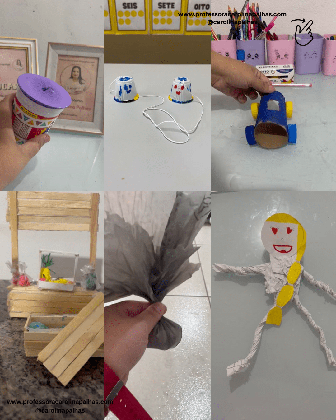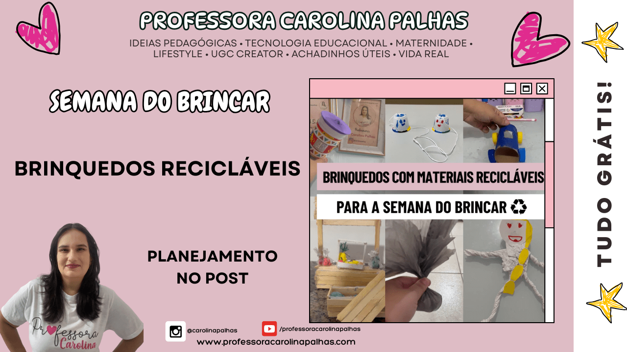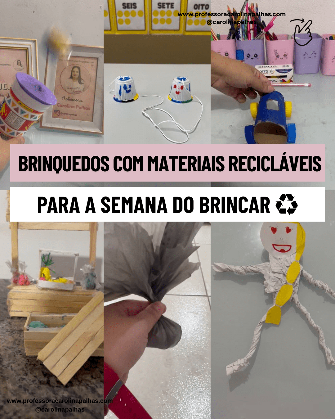 palavras-chave: Semana do Brincar, atividades com recicláveis, brinquedos recicláveis, educação infantil, coordenação motora, sustentabilidade na escola, pedagogia lúdica, ideias criativas para sala de aula, professora Carolina Palhas, atividades sustentáveis, brincadeiras pedagógicas, BNCC, tecnologia e criatividade, reciclagem com crianças