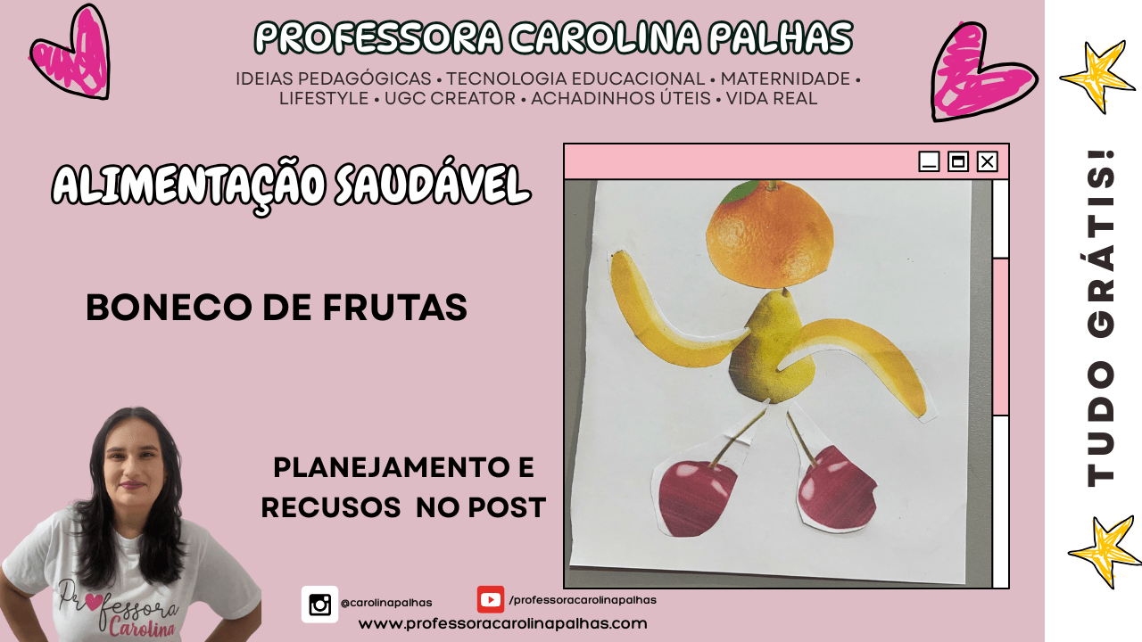 alimentação saudável, educação infantil, boneco de frutas, atividades lúdicas, planejamento semanal, BNCC, coordenação motora, colagem educativa, frutas na educação, projeto alimentação, ideias pedagógicas, Carolina Palhas