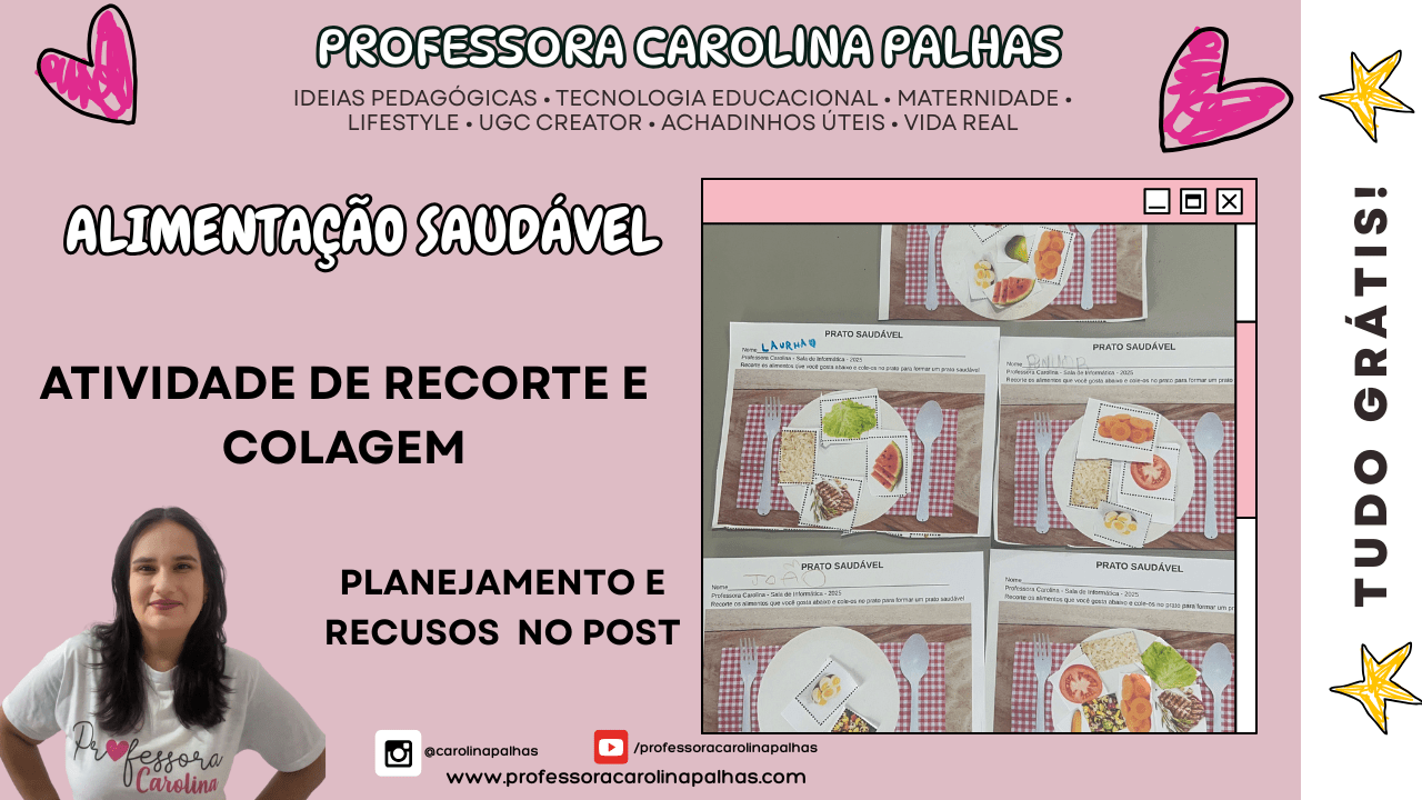 alimentação saudável, prato saudável, educação infantil, recorte e colagem, atividades lúdicas, planejamento semanal, BNCC, coordenação motora fina, hábitos alimentares, saúde infantil, Carolina Palhas, recursos pedagógicos, ideias pedagógicas, professoras de educação infantil, ensino por projetos, tecnologia educacional