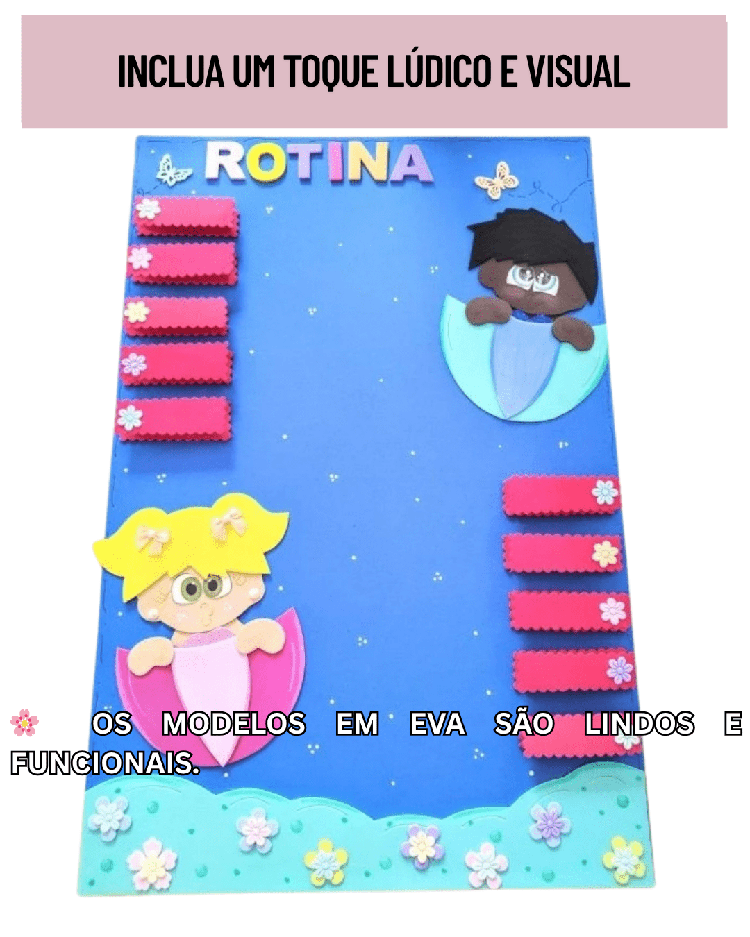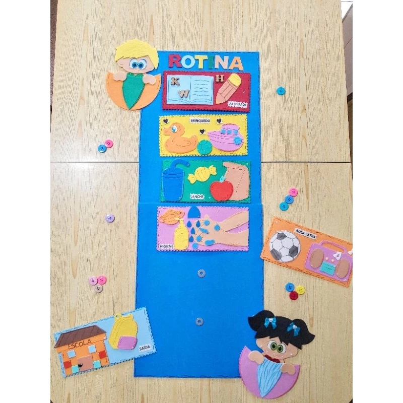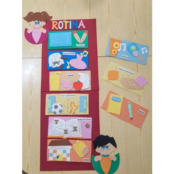 Se você procura um modelo pronto e encantador, uma dica são os kits de rotina em EVA que você encontra em lojas online como a Shopee. Eles são coloridos, resistentes e funcionais.