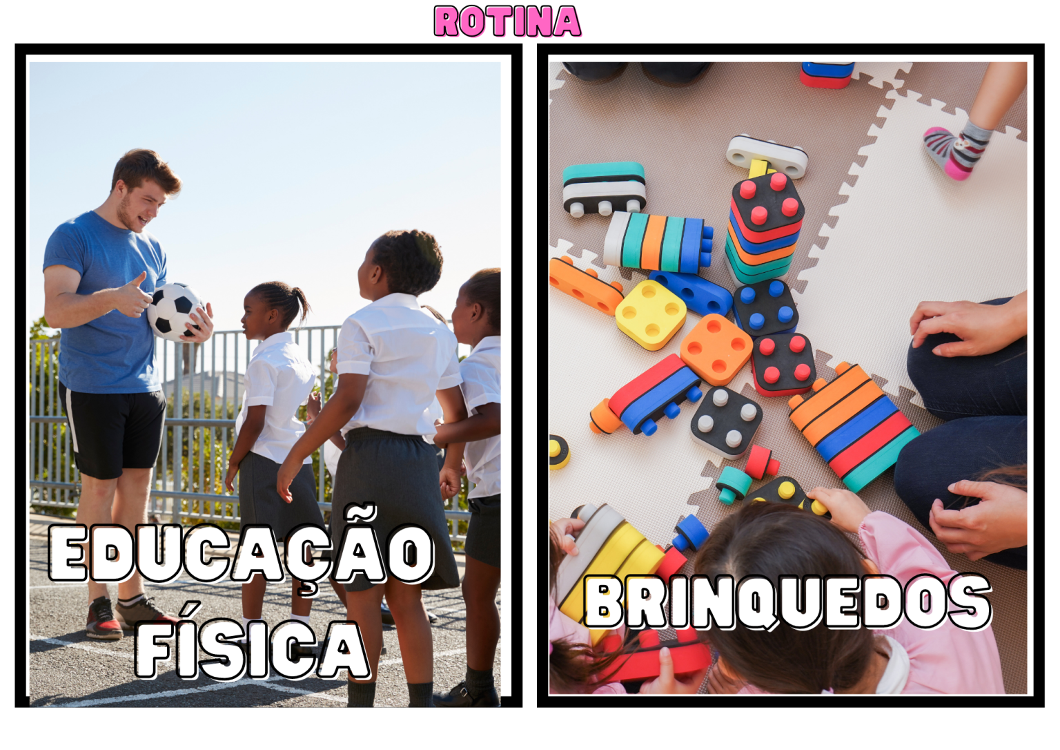 Ao montar a rotina visual, prefira utilizar imagens reais que representem as atividades propostas. Mesmo que não sejam fotos da sua turma, escolha figuras que retratem situações comuns do cotidiano infantil: crianças brincando, comendo, escovando os dentes, participando de rodas de conversa ou brincadeiras livres.