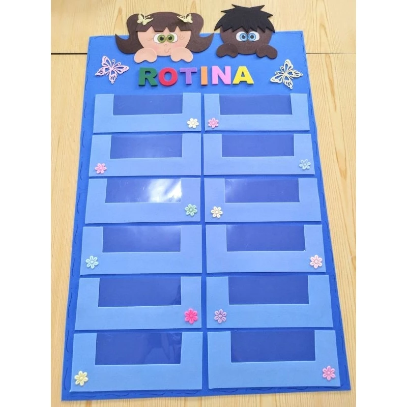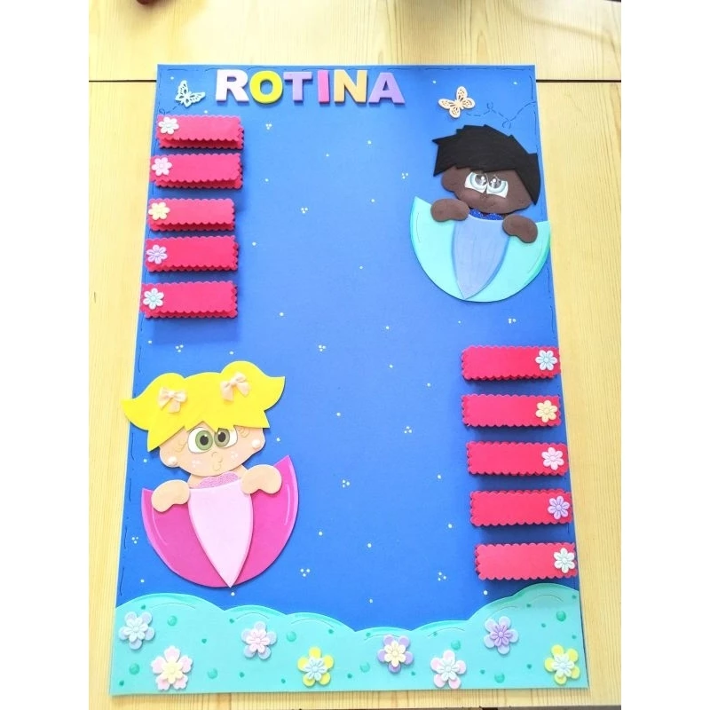 Para enriquecer a rotina visual, você pode incluir elementos decorativos, como plaquinhas feitas em E.V.A com personagens, cores e texturas que chamem a atenção dos pequenos. Esses elementos deixam o momento mais atrativo e divertido.