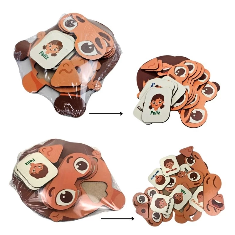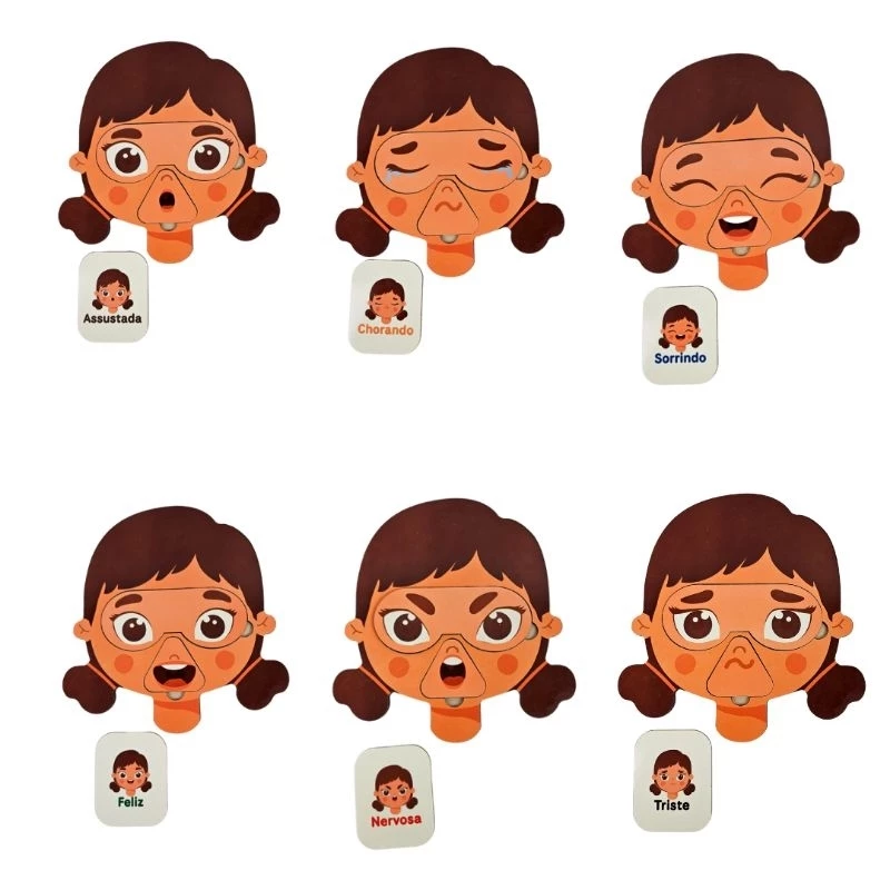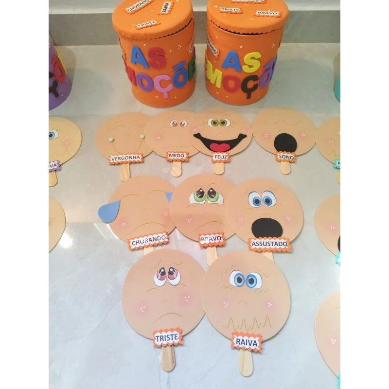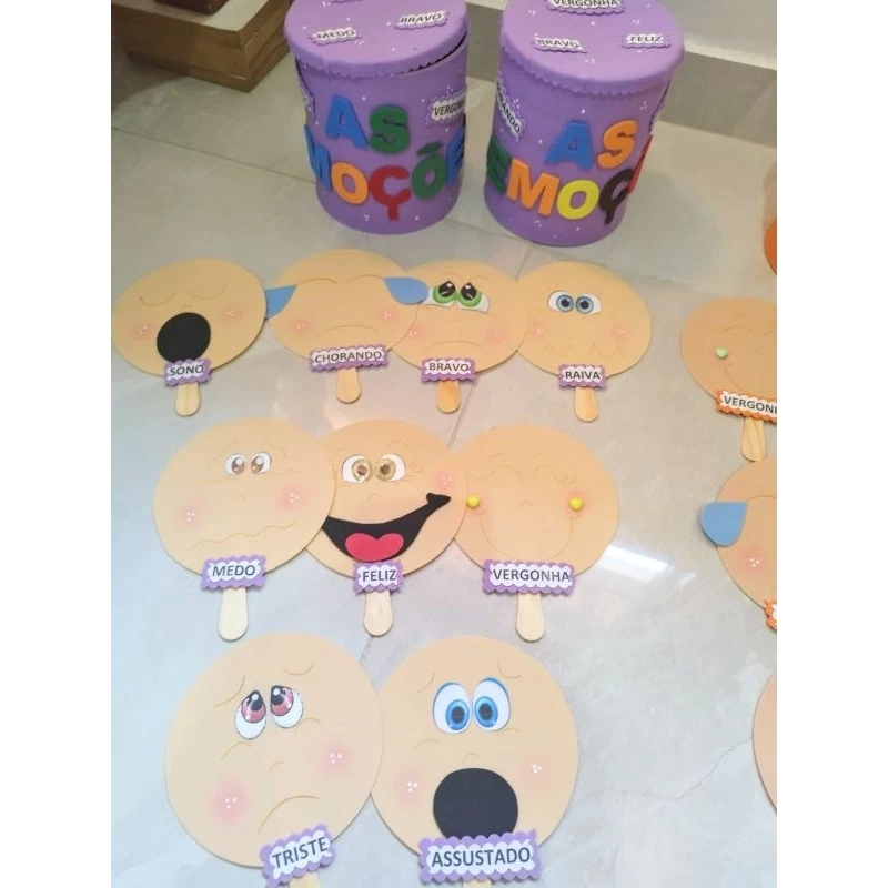 Este conjunto inclui carinhas em EVA com diferentes expressões e nomes das emoções. Além de visualmente atraente, é resistente e perfeito para o uso constante em atividades de rotina.